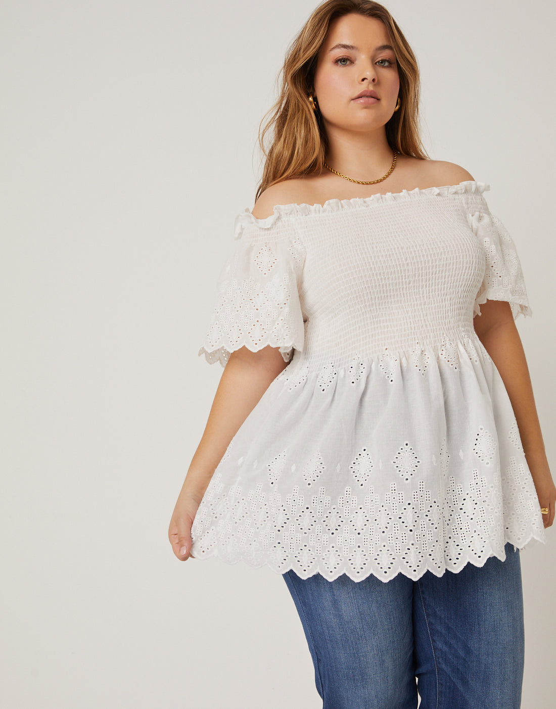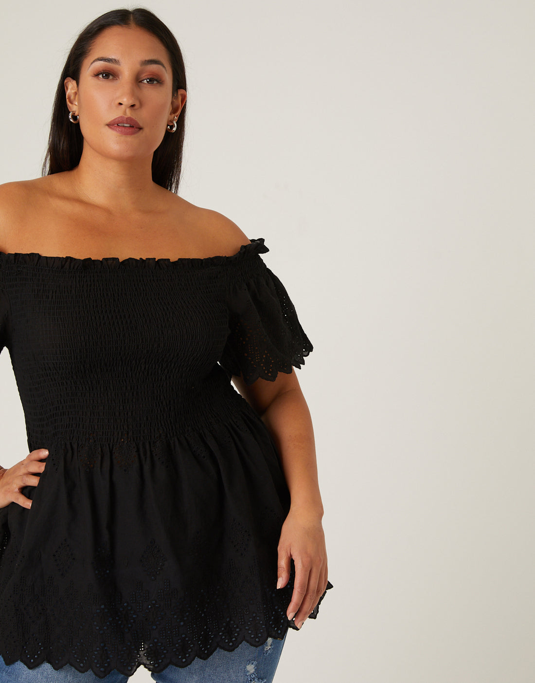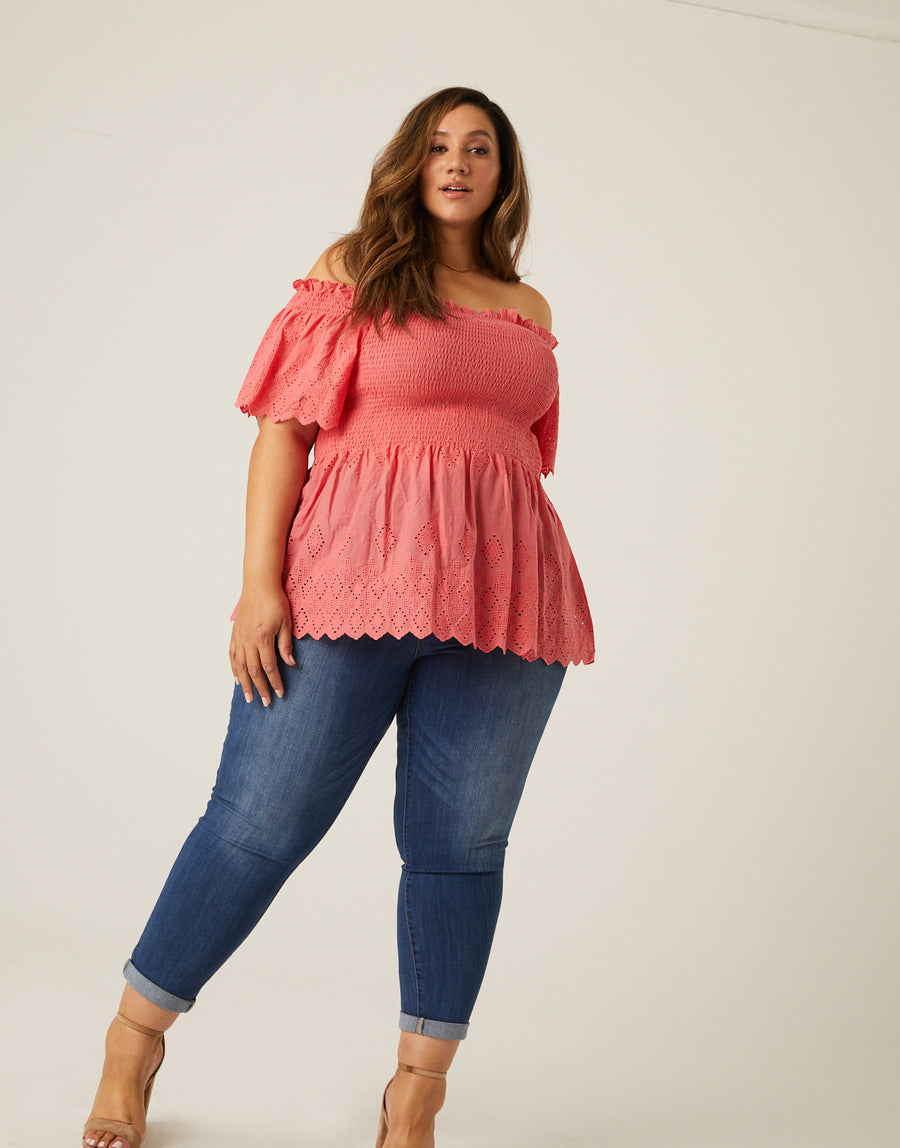 A summer top that's as trendy as it is flattering, the Plus Size Smocked Eyelet Lace Top is a perfect beach day top. This top comes in four classic colors; black, white, aqua blue, and coral. We love styling this plus size off the shoulder top for warm weather days with a pair of shorts to keep you cool all day long.
