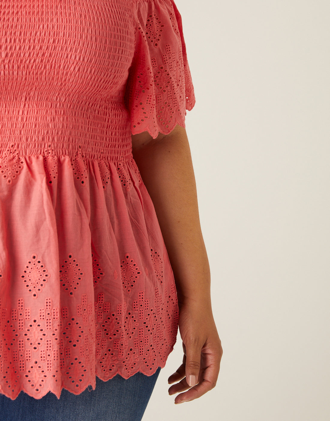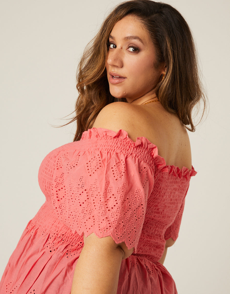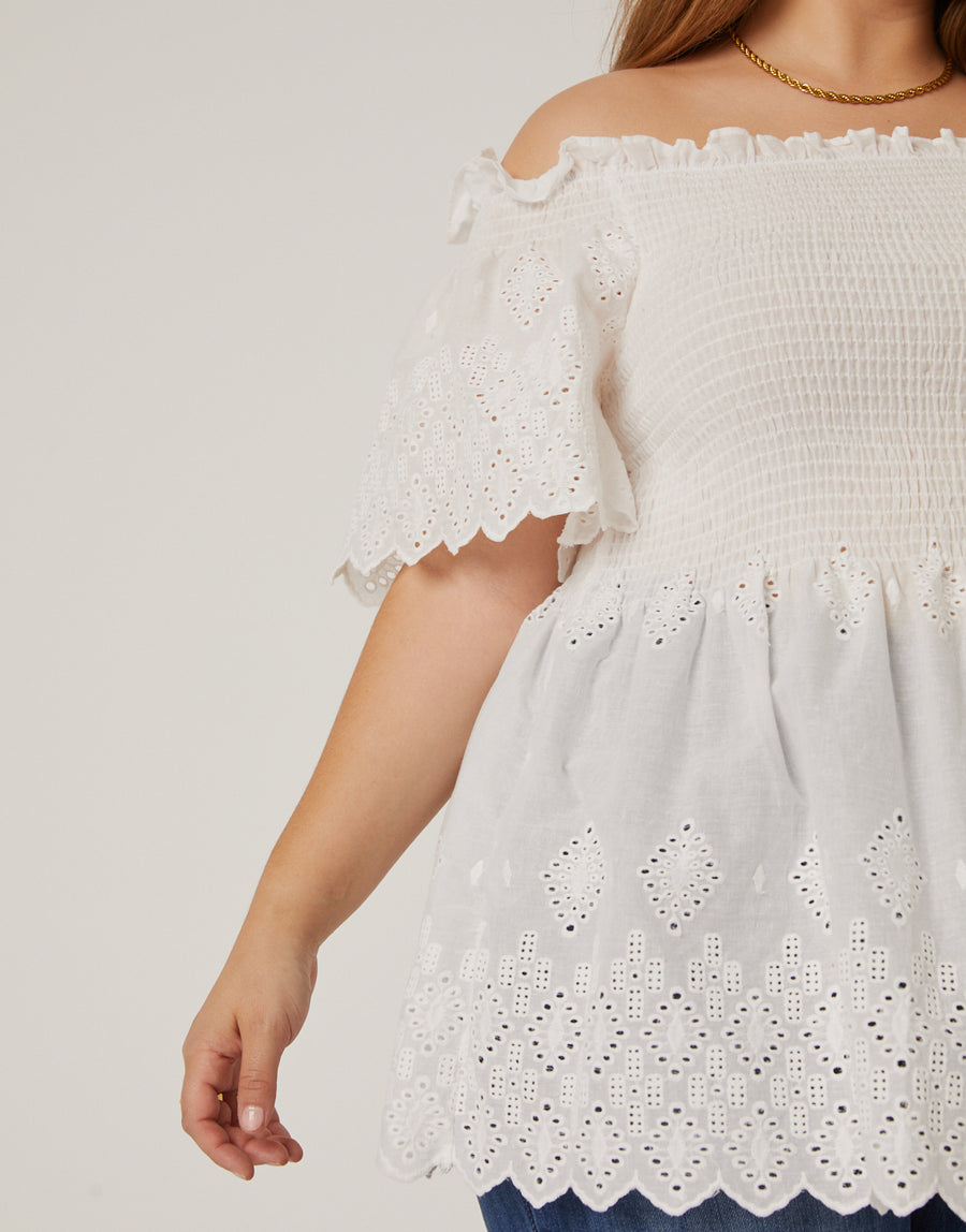 A summer top that's as trendy as it is flattering, the Plus Size Smocked Eyelet Lace Top is a perfect beach day top. This top comes in four classic colors; black, white, aqua blue, and coral. We love styling this plus size off the shoulder top for warm weather days with a pair of shorts to keep you cool all day long.