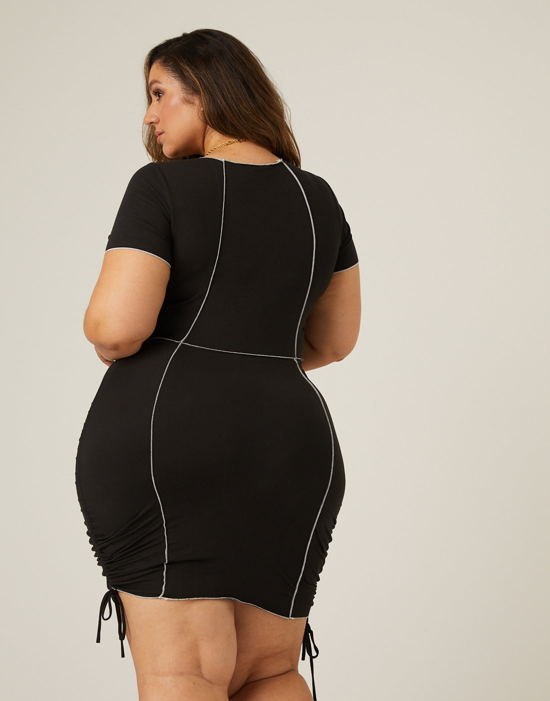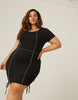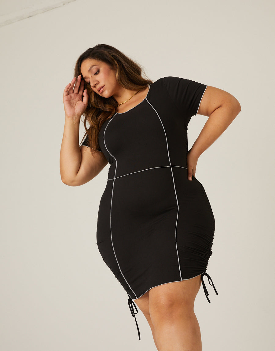 - It features exposed seams details, a scoop neckline, and adjustable ruching on both sides.