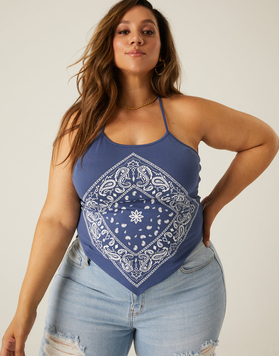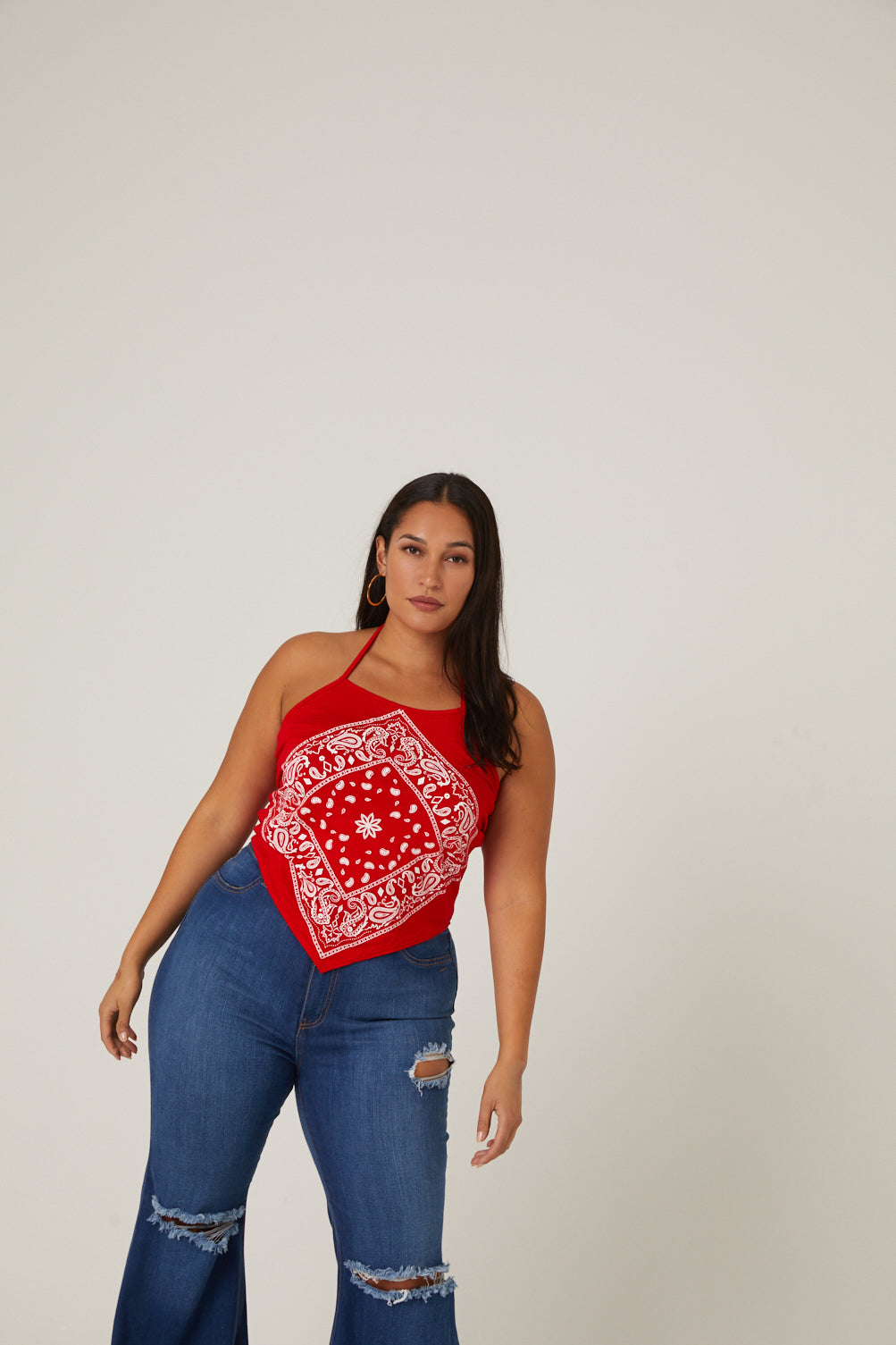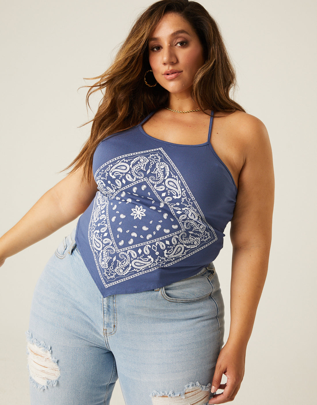 Have fun with prints by adding the Plus Size Bandana Halter Top to your wardrobe. This trendy plus size tank top is great for festivals and warm days. A simple outfit paired with some jeans and boots will make this top an iconic part of your wardrobe.