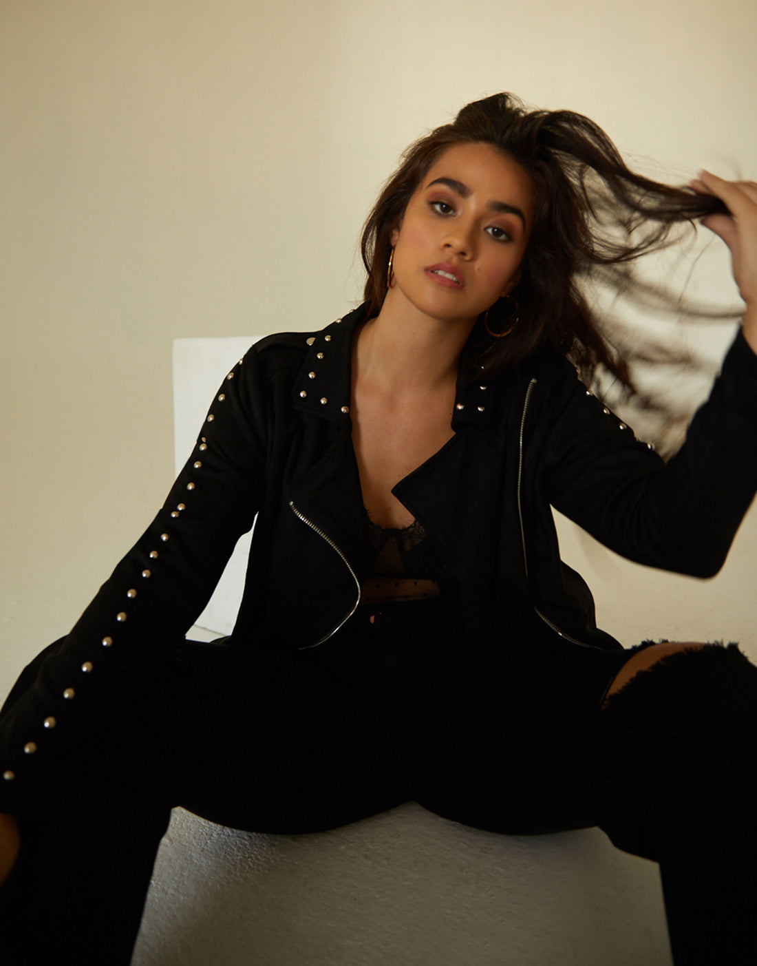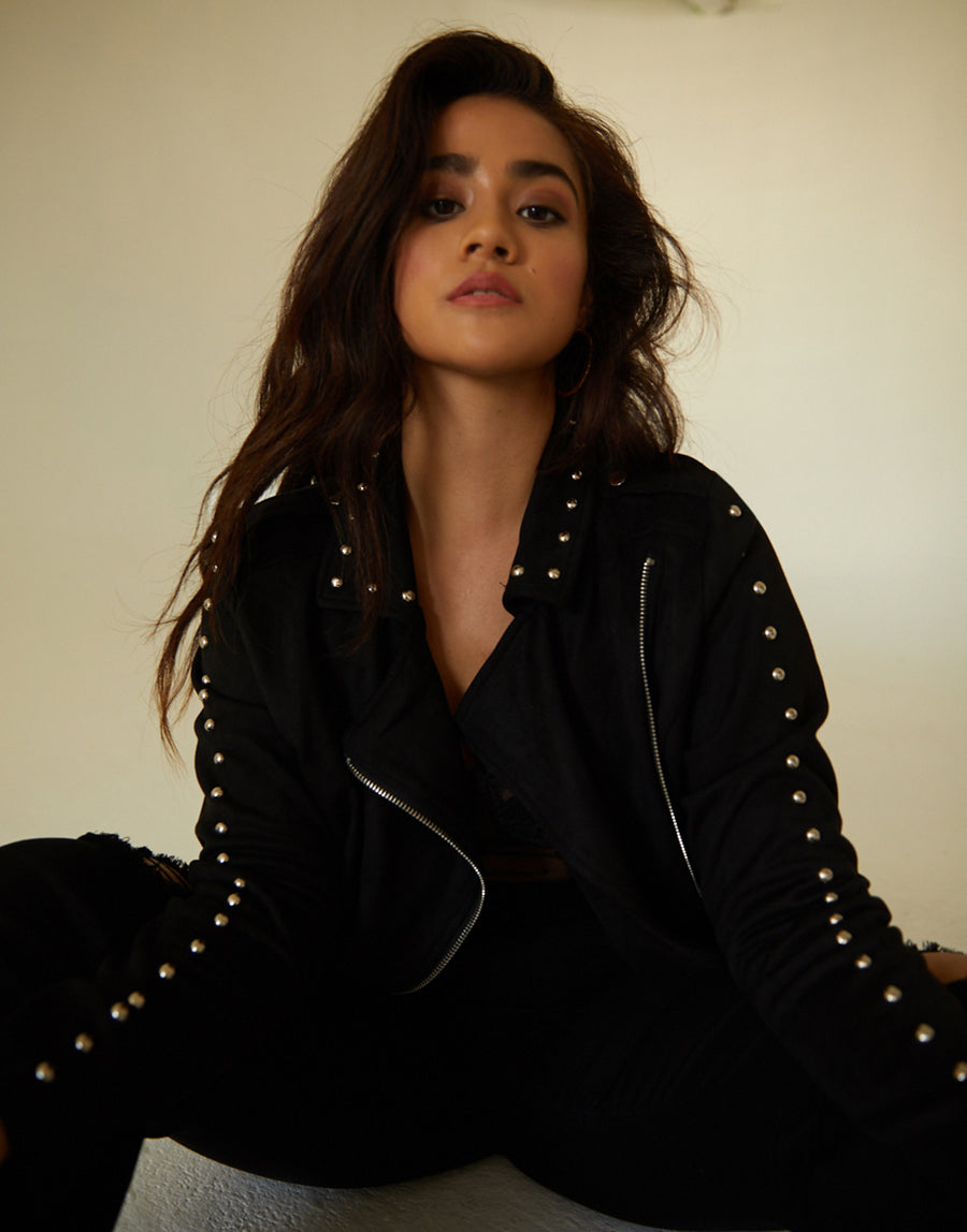 You will definitely look and feel like a rock star in our Curve Layla Suede Jacket! This soft-as-could-be jacket boasts studs around the collar and down the arms, a buckled embellishment on the shoulders, an asymmetrical zipper, and is made from super soft, lightweight faux suede. This jacket will fit perfectly over just about any outfit, from jeans and a tee-shirt to a cocktail dress, which makes it a versatile addition to any wardrobe.