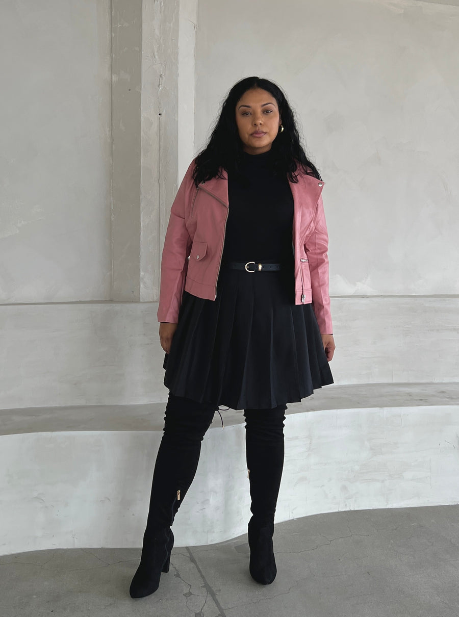 The edgy babes wardrobe essential, the Curve Leather Biker Jacket. The classic fit and chunky silver hardware makes for a year around closet staple. It's all about the details with this faux leather moto jacket, from the lapel snaps to the zip sleeves, we've got you covered. This leather jacket also features a waist belt and front zipper pockets. Pair this with a graphic tee for that effortless edgy look.