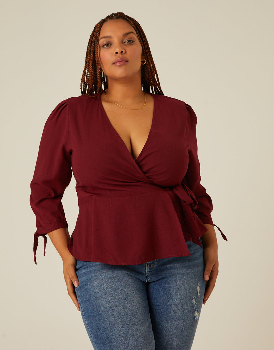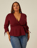Curve Long Sleeve Woven Wrap Top Plus Size Tops Burgundy 1XL -2020AVE