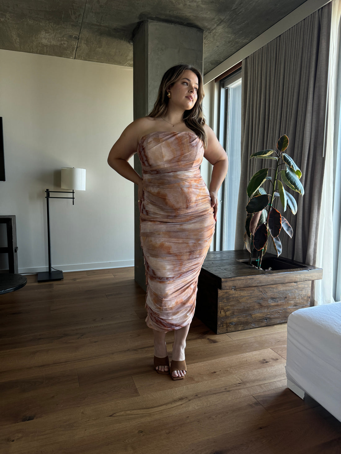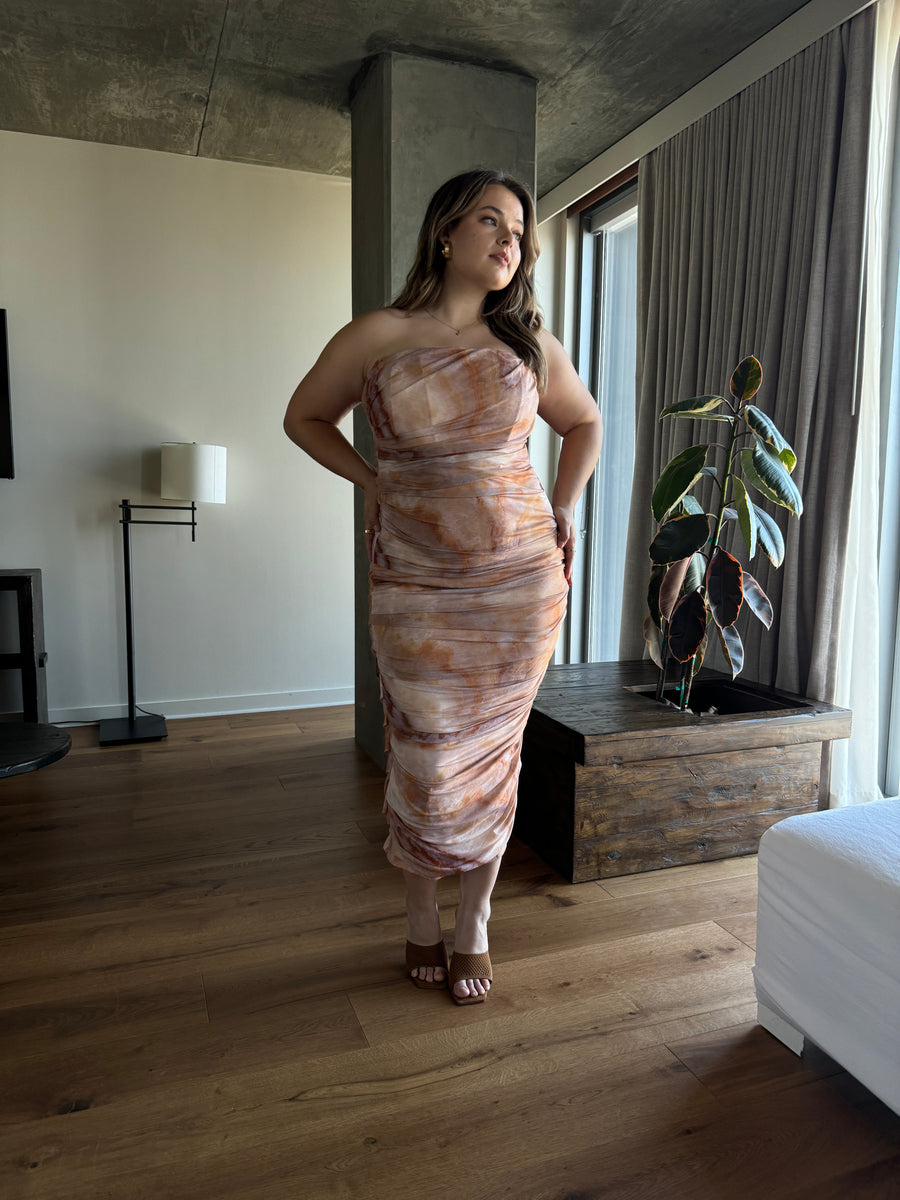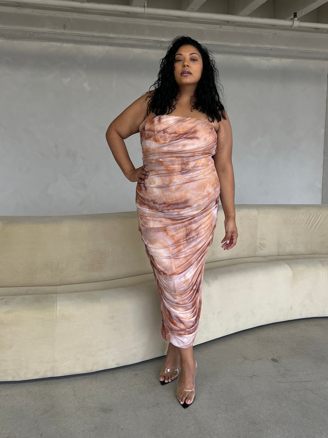 Our Plus Size Tie Dye Ruched Dress is a perfect addition to your wardrobe. With a fun tie-dye pattern, a feminine ruched waist, and an open back, it's guaranteed to make you feel beautiful and elegant. Grab your favorite bag and make everyone jealous!