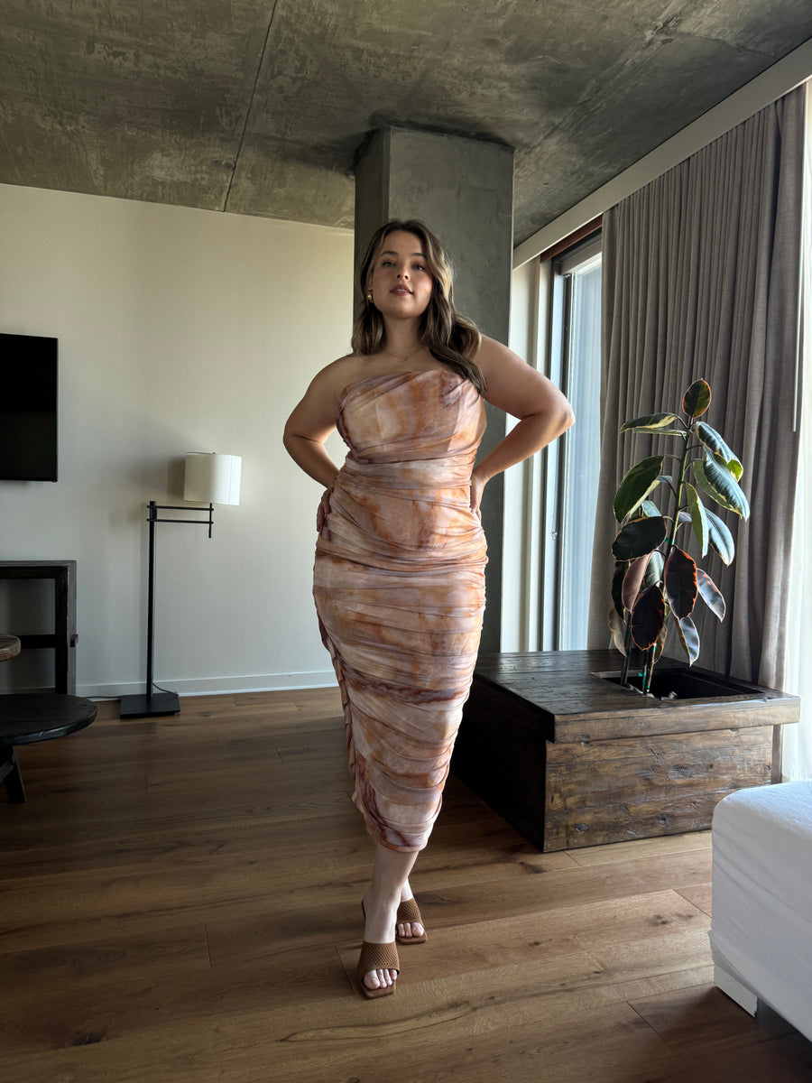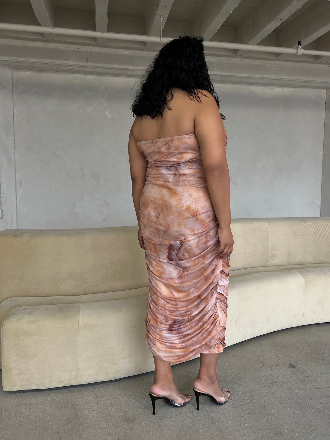 • This dress features a sleeveless, sweetheart neckline, ruching all over, a tie-dye pattern, an open back, wiring in the bust, and a midi length.