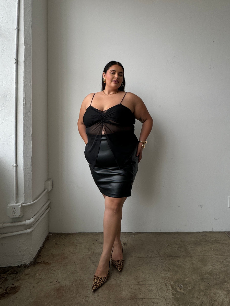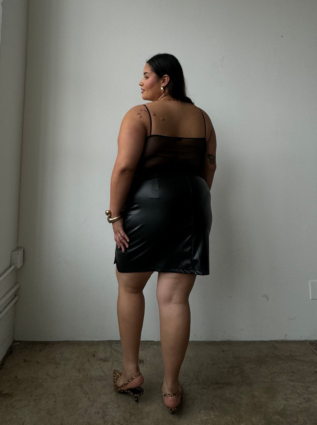 Step into your power in the Plus Size PU Leather Mini Skirt—a bold, body-hugging essential that turns heads with every step. This faux leather mini features a flattering high-stretch waistband, curve-contouring fit, and a sleek side slit for just the right amount of leg. The smooth, buttery texture adds a luxe feel while staying soft and comfortable against your skin. Whether paired with a statement cami or oversized blazer, this piece serves confidence, edge, and main character energy all in one. Night out? This skirt came ready.
