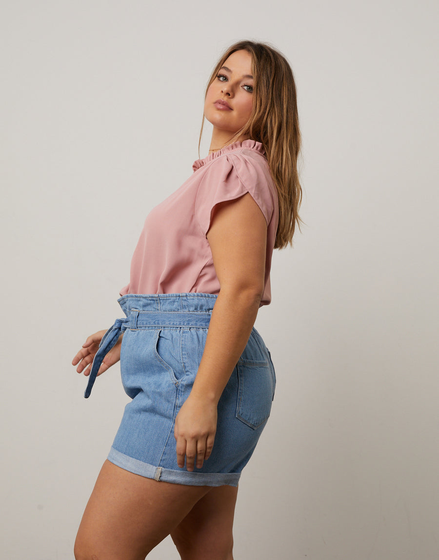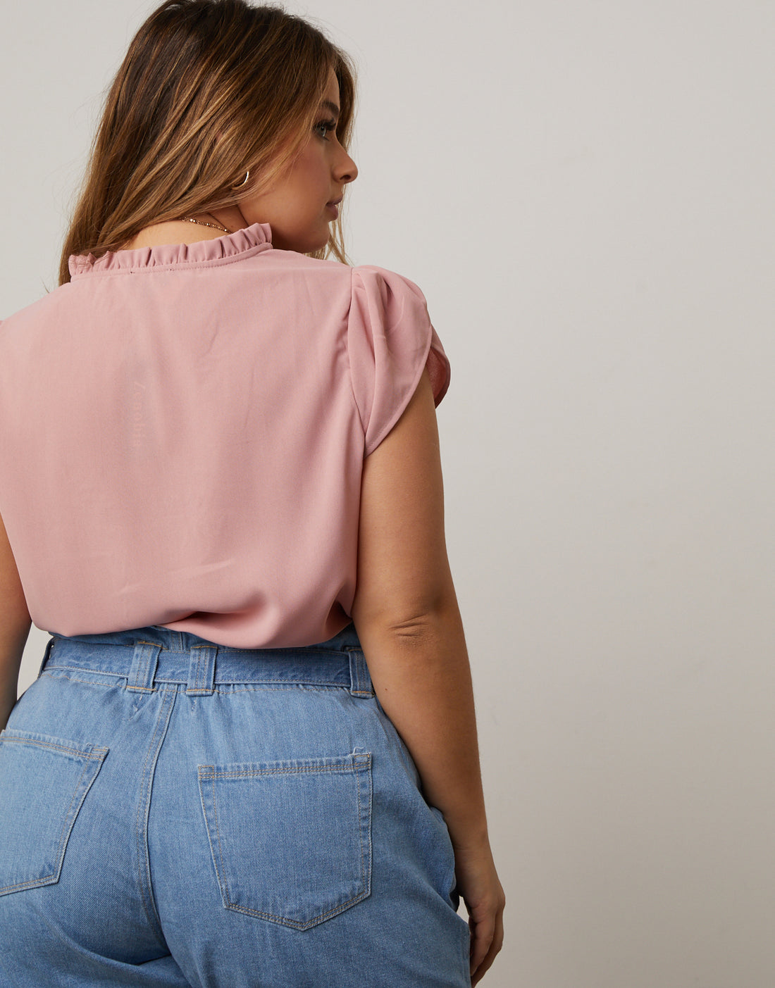 - This tulip sleeve chiffon top features short sleeves with a ruffled shoulder detail, buttons down the bust, and a gathered neckline.