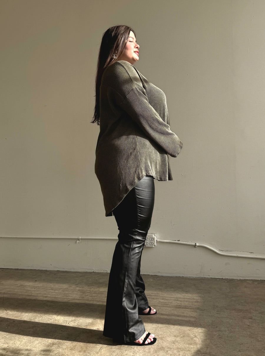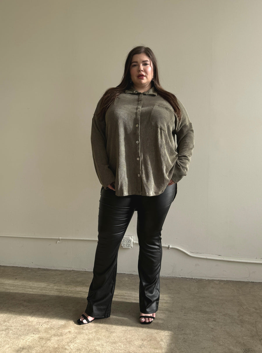 Step into your main character moment with our Plus Size Faux Leather Flare Pants—a sleek, curve-enhancing staple designed to do the most. Crafted from luxe stretch faux leather, these pants sculpt and smooth in all the right places while keeping you comfortable from day to night. The flared silhouette serves up serious 'it girl' energy, whether you're dressing them up with heels or going full off-duty baddie with sneakers. Perfect for girls who want to make a statement, these pants are a year-round power piece you'll keep reaching for. Style tip: pair with an oversized button down or cropped tee and let your confidence do the talking.