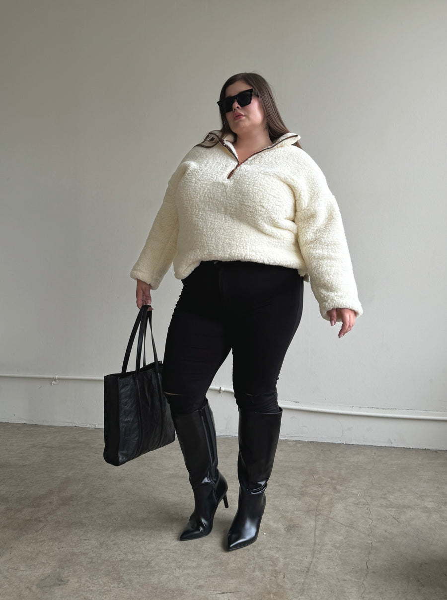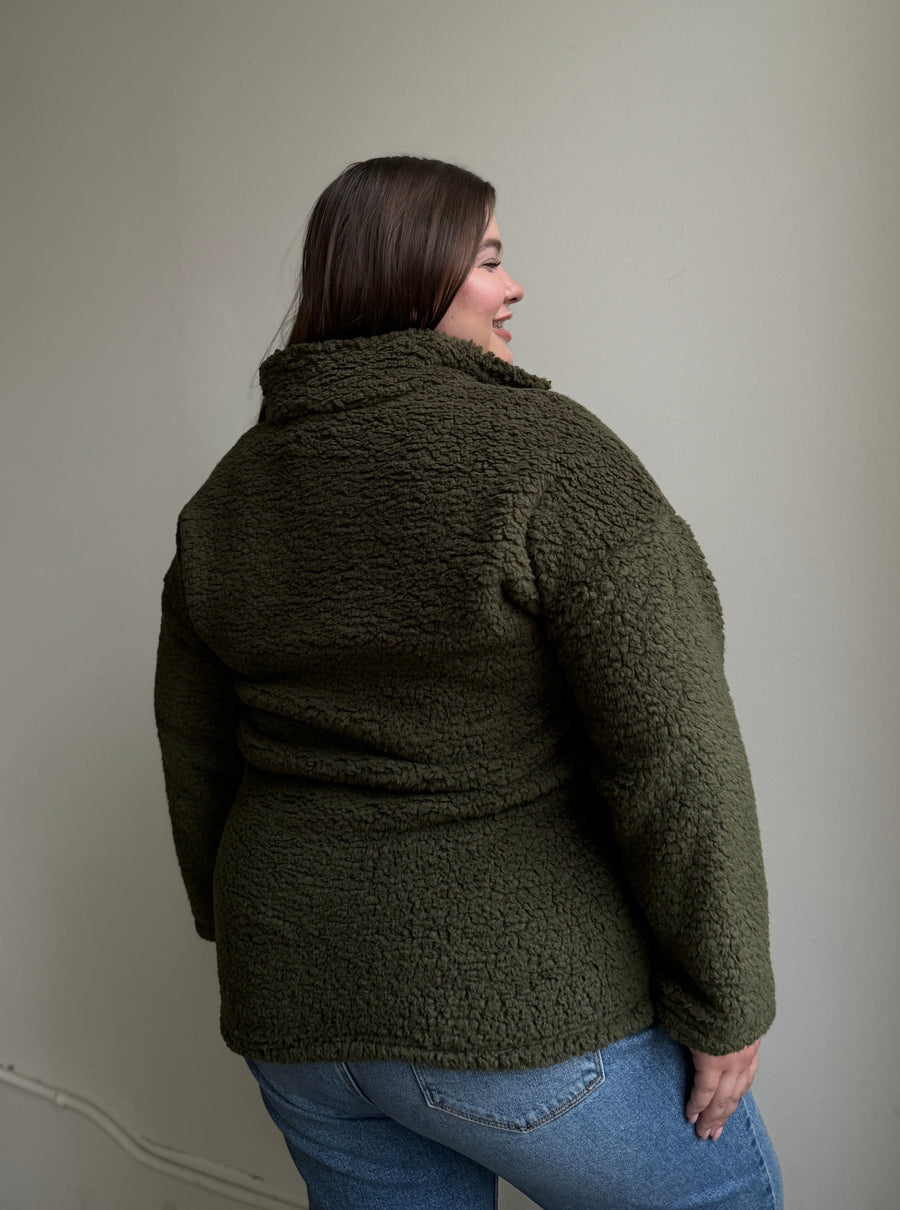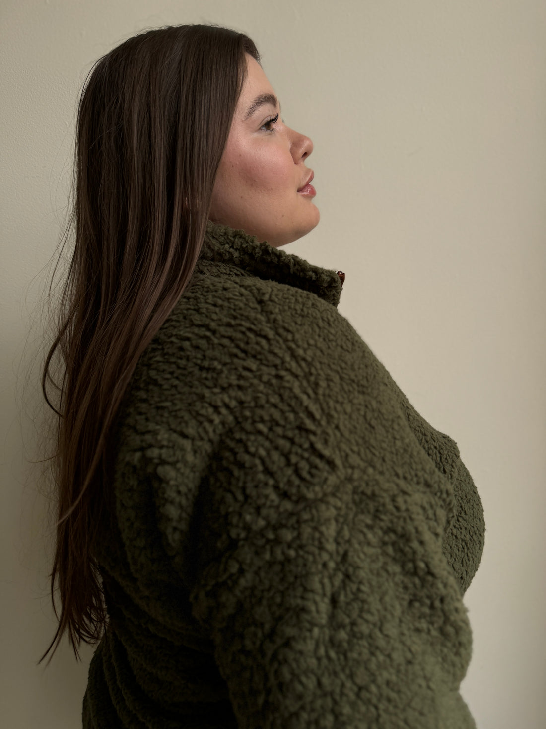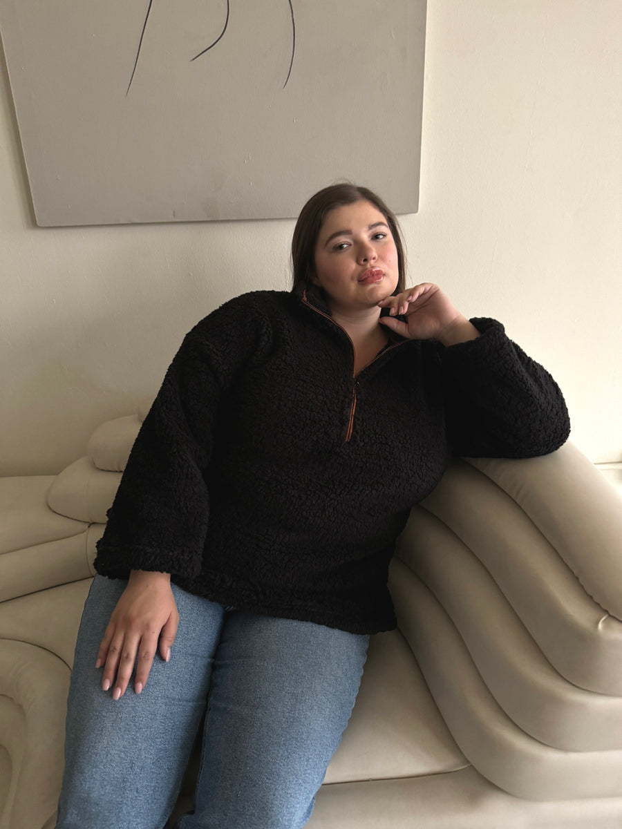 Stay stylishly cozy in the Plus Size Half Zip Teddy Pullover. Luxuriously soft and lightweight, this top features a brown lining on the zipper and collar to elevate the look of this chic design. Relaxed and oversized, this is the perfect layer for any cold-weather wardrobe! Throw it on with your favorite joggers for a comfy loungewear look.