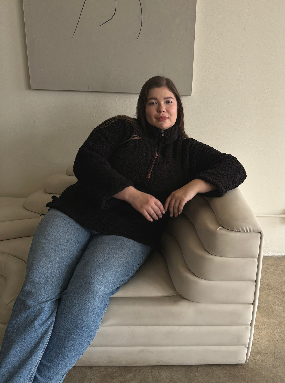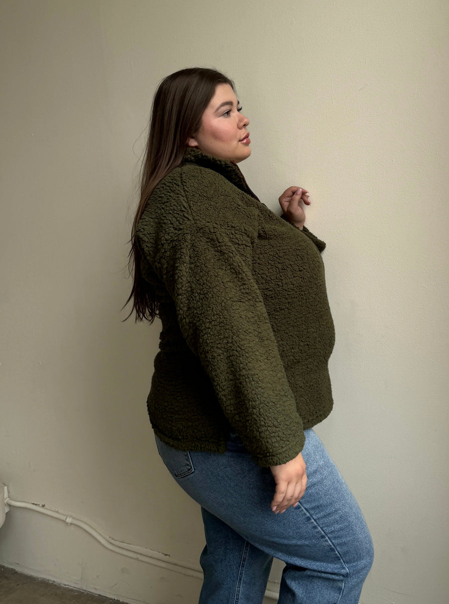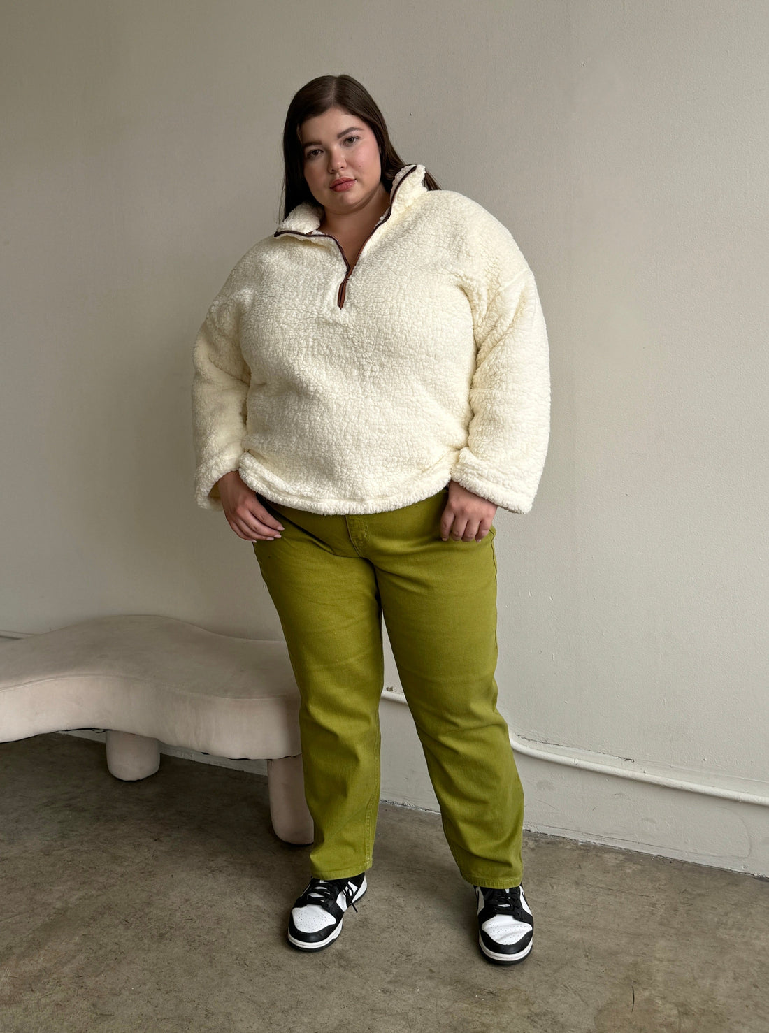 Stay stylishly cozy in the Plus Size Half Zip Teddy Pullover. Luxuriously soft and lightweight, this top features a brown lining on the zipper and collar to elevate the look of this chic design. Relaxed and oversized, this is the perfect layer for any cold-weather wardrobe! Throw it on with your favorite joggers for a comfy loungewear look.