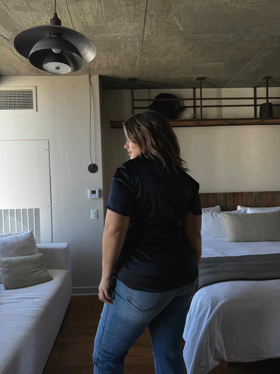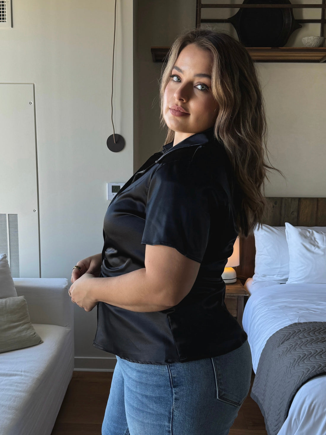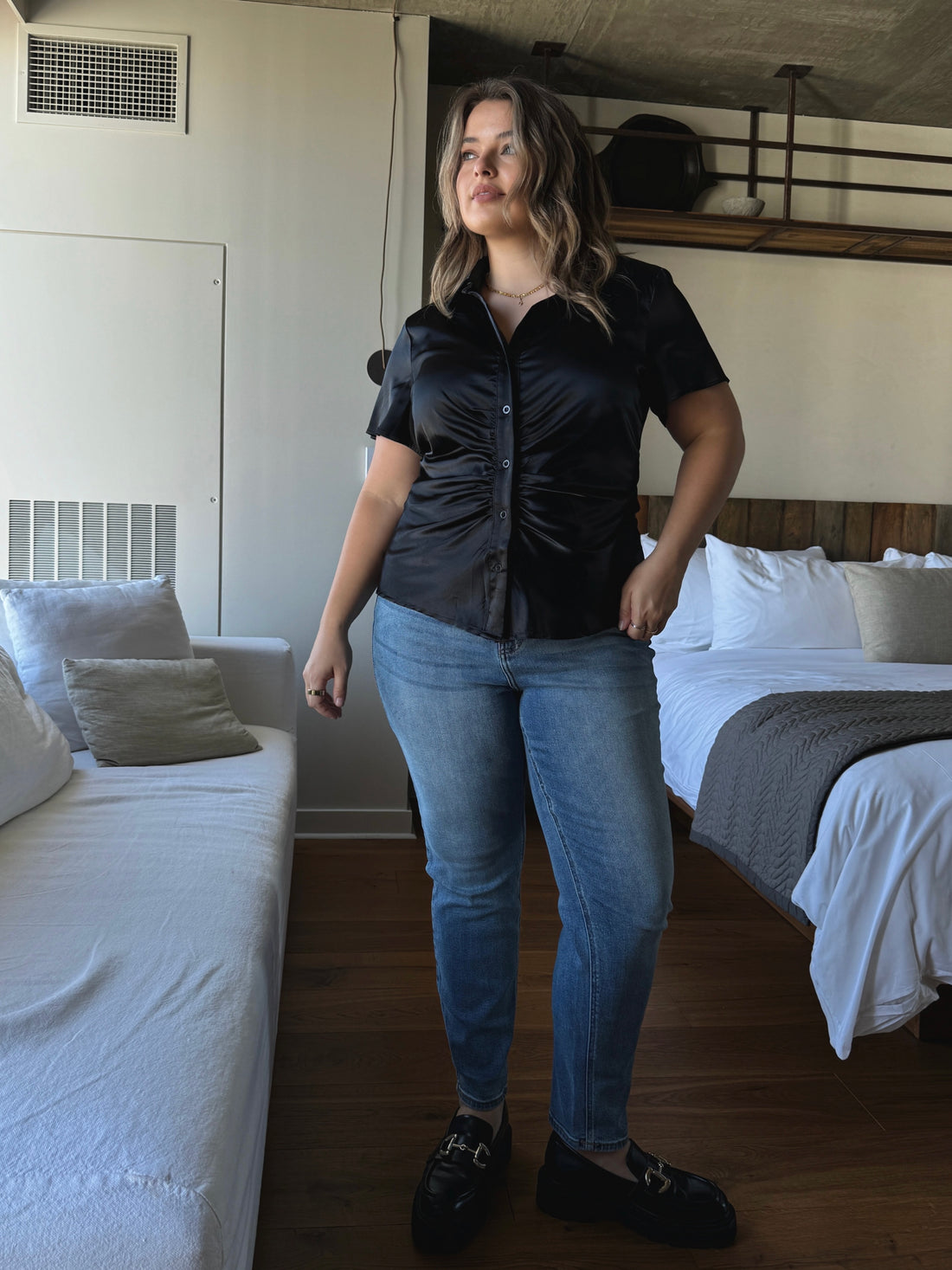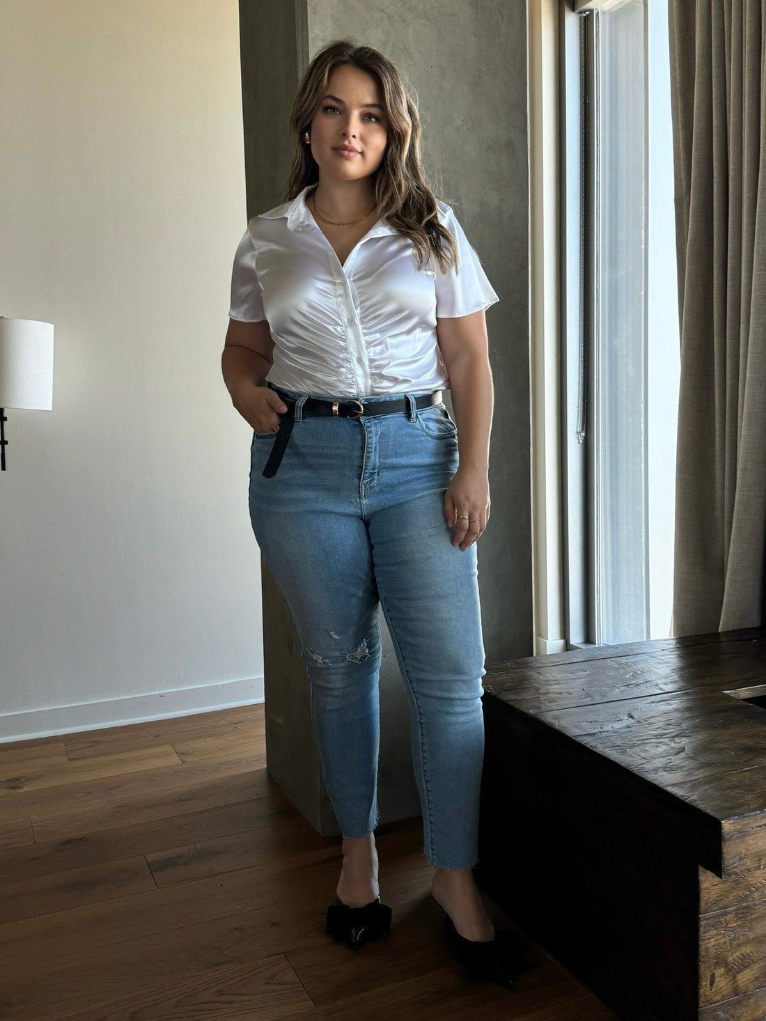 Workwear just got a glow-up. The Plus Size Ruched Short Sleeve Button Down Top features a sleek satin finish, classic collar, and figure-loving front ruching that contours your shape while adding a bold, modern twist. This isn’t your basic button down—it’s elevated, snatched, and ready to style with jeans, skirts, or tailored pants for a clean, luxe vibe. Whether you’re clocking in or heading to cocktails, this is the kind of piece that keeps you looking polished without sacrificing comfort.