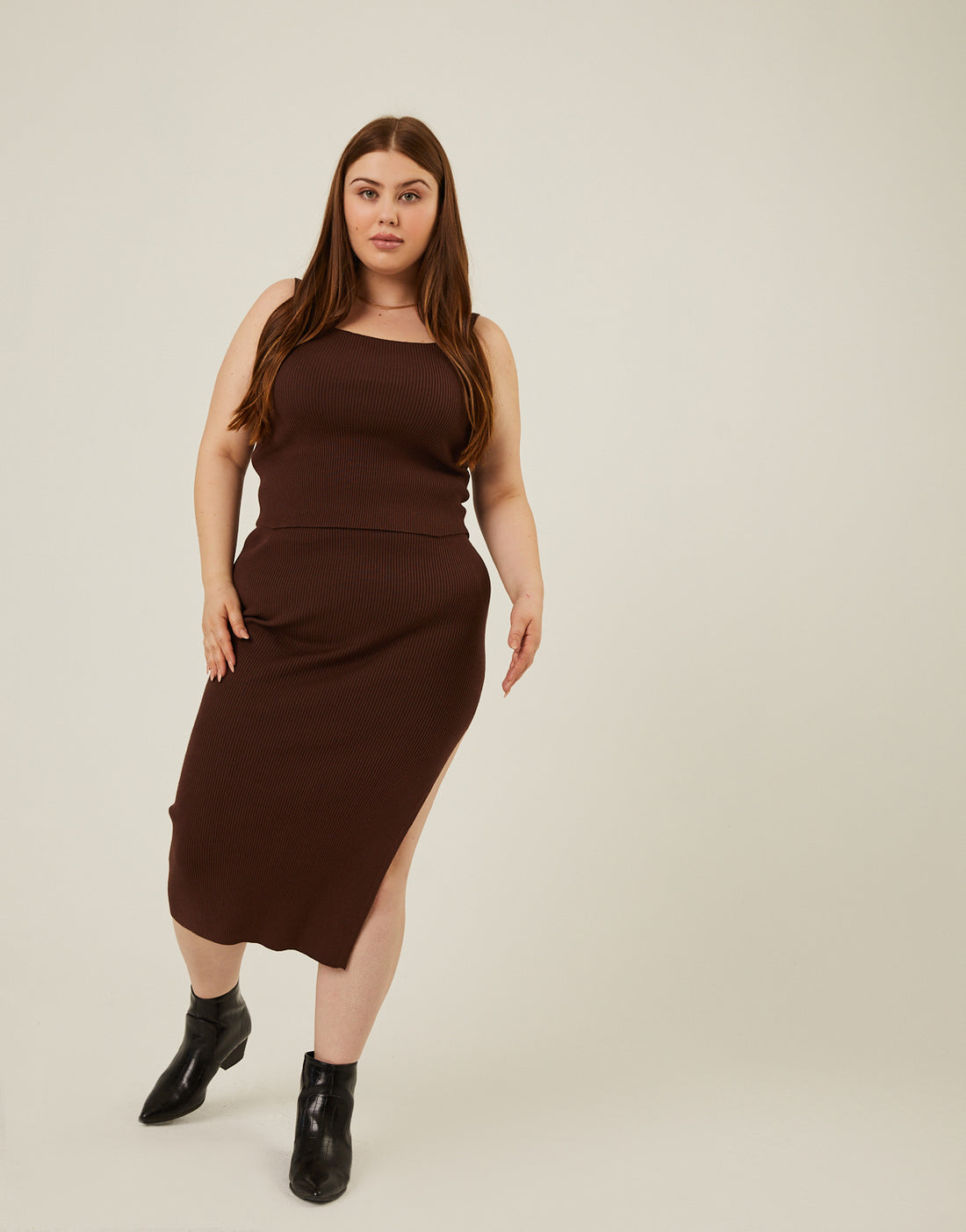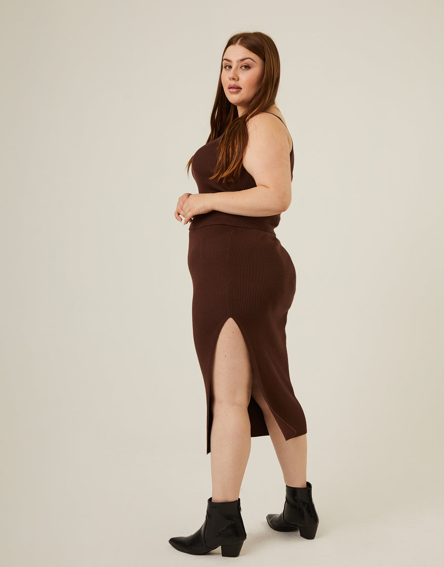 Curve Rib Knit Midi Skirt Plus Size Bottoms Brown 1XL -2020AVE