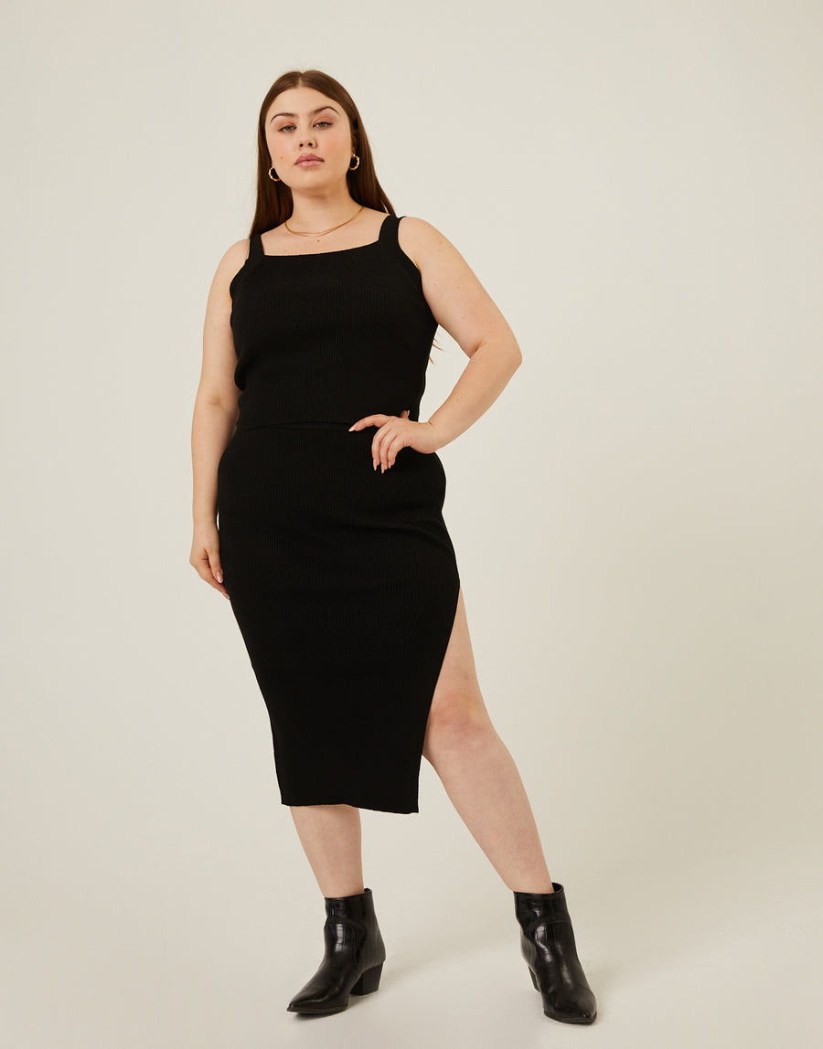 Curve Rib Knit Midi Skirt Plus Size Bottoms -2020AVE