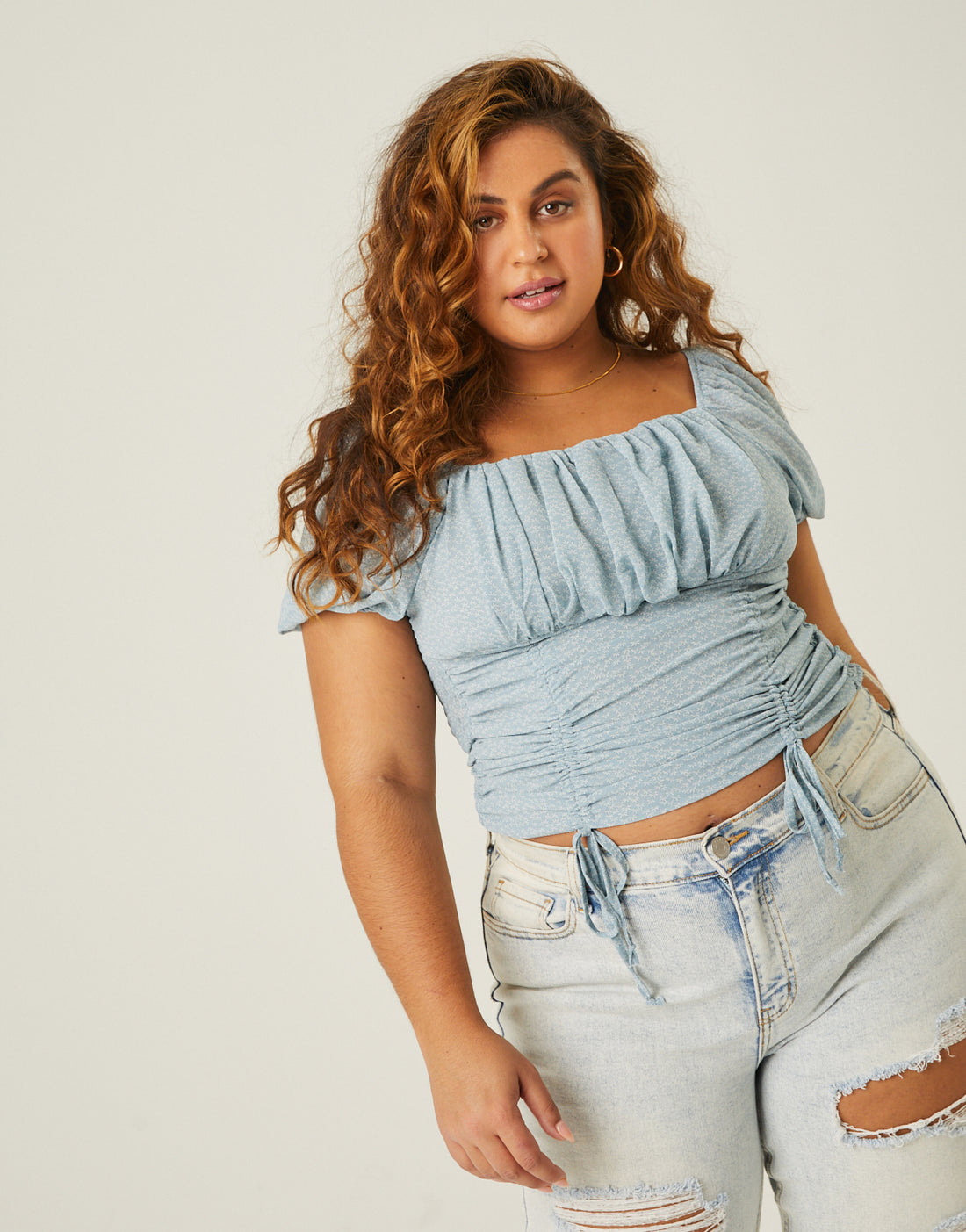 - This top features double ruching up front that is adjustable and ties at the bottom, a gathered bustline, a smocked back, and short puff sleeves.