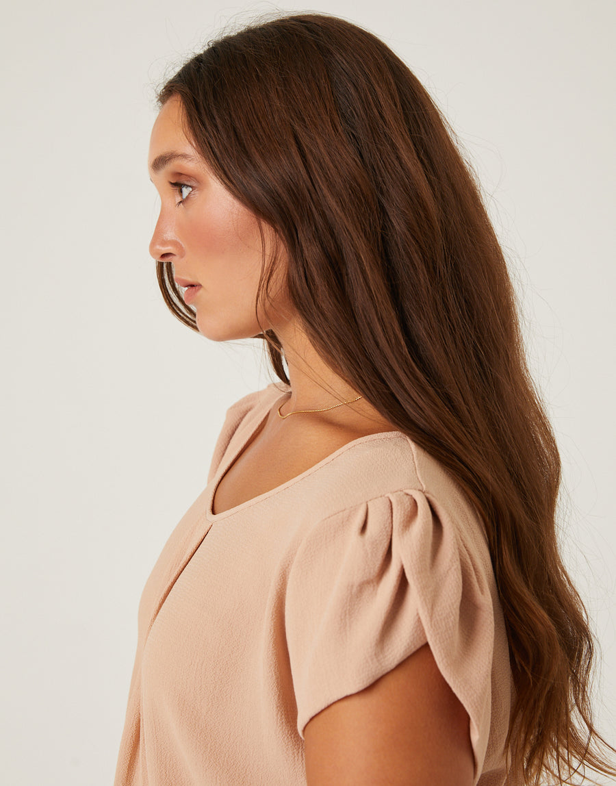- This top features pleated cap sleeves, a button at the back of the neck, a rounded neckline, and a flowy silhouette.