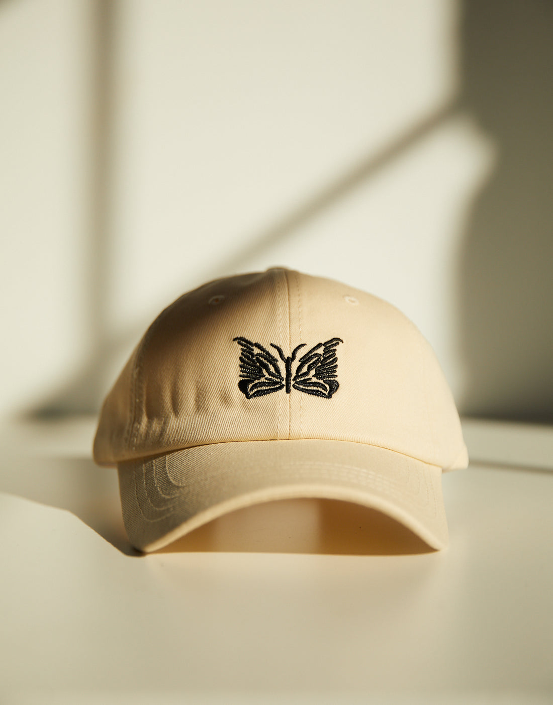• This hat is made out of a woven twill material and features a single butterfly embroidery on front and a buckle in back for adjustability.