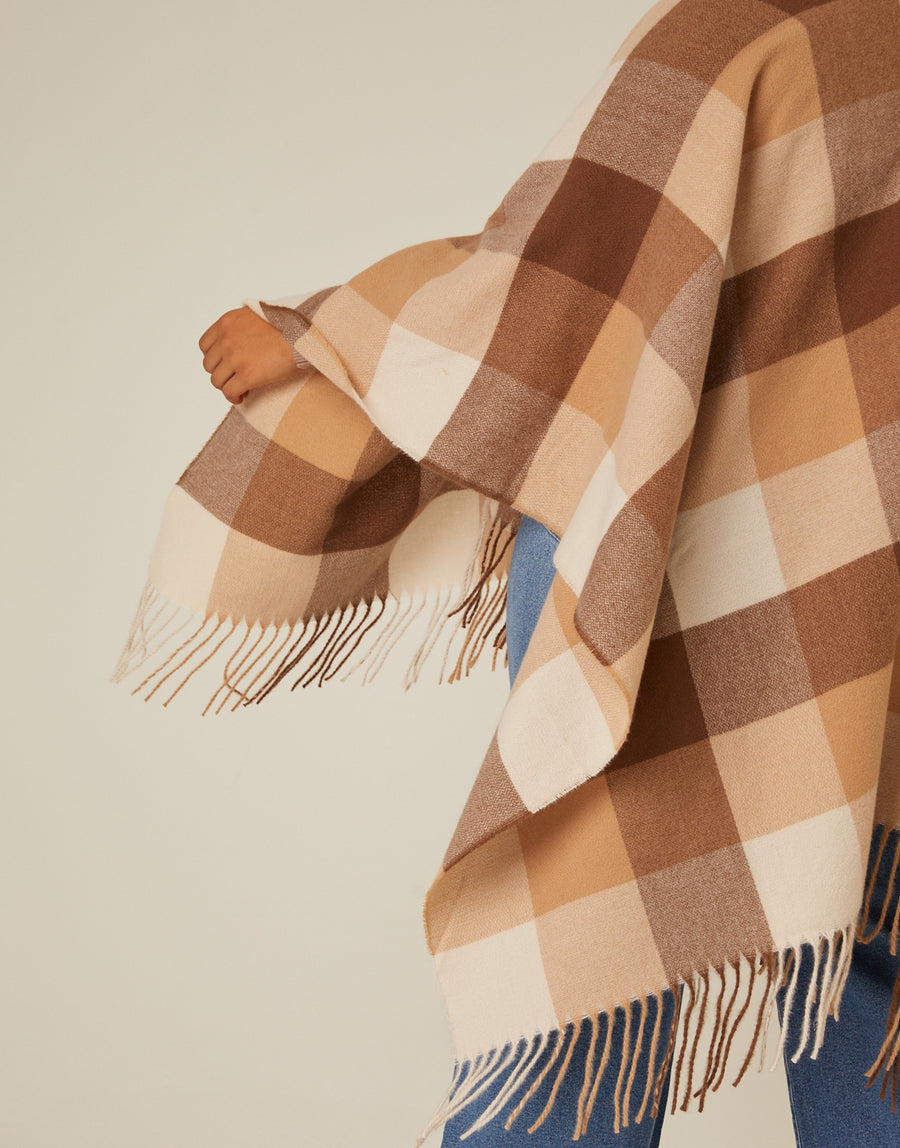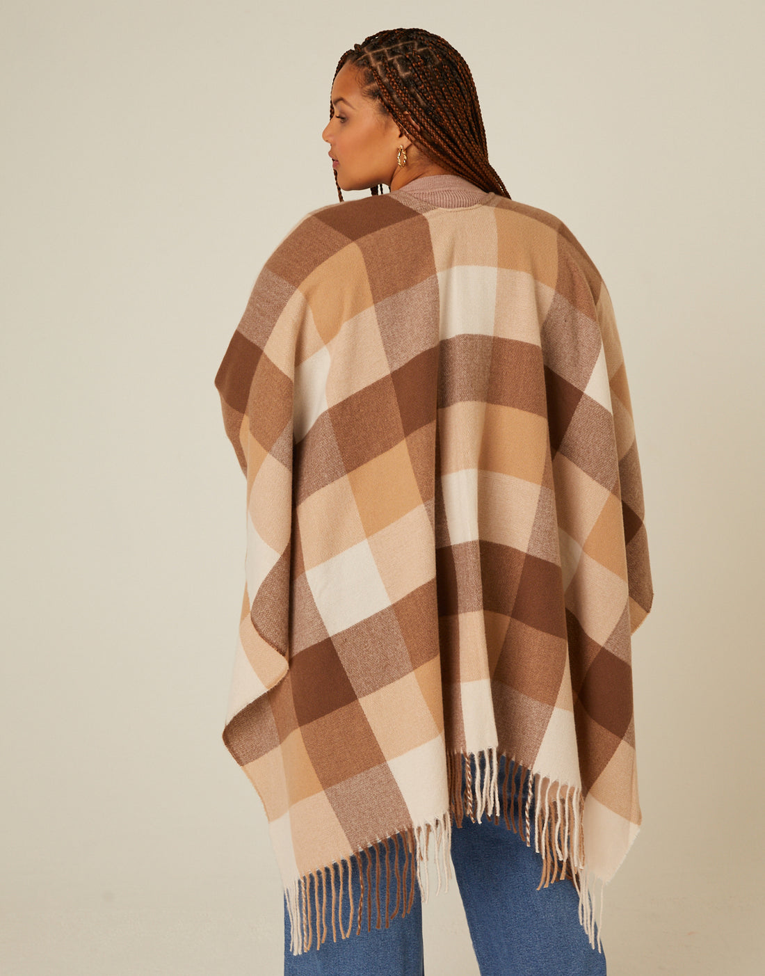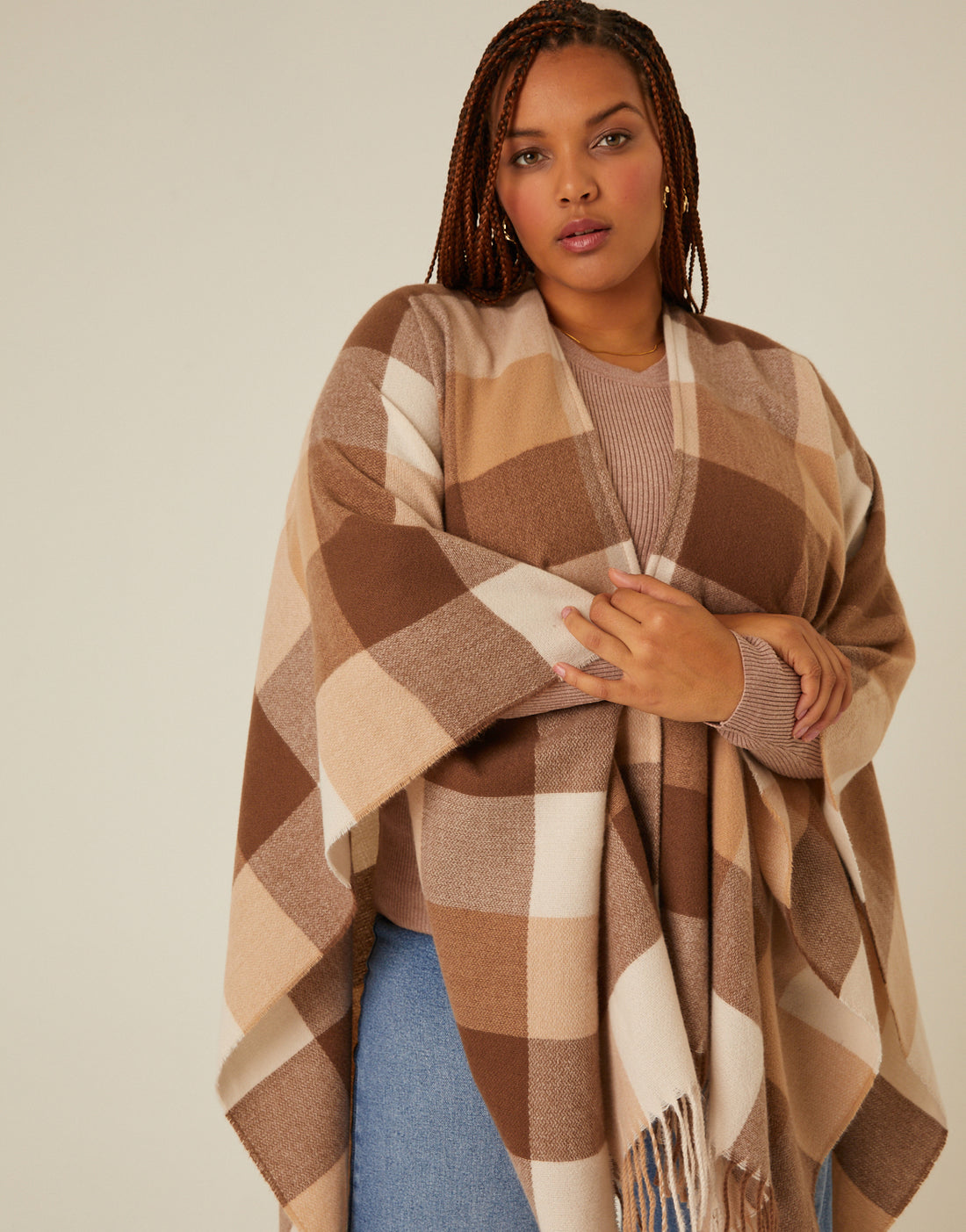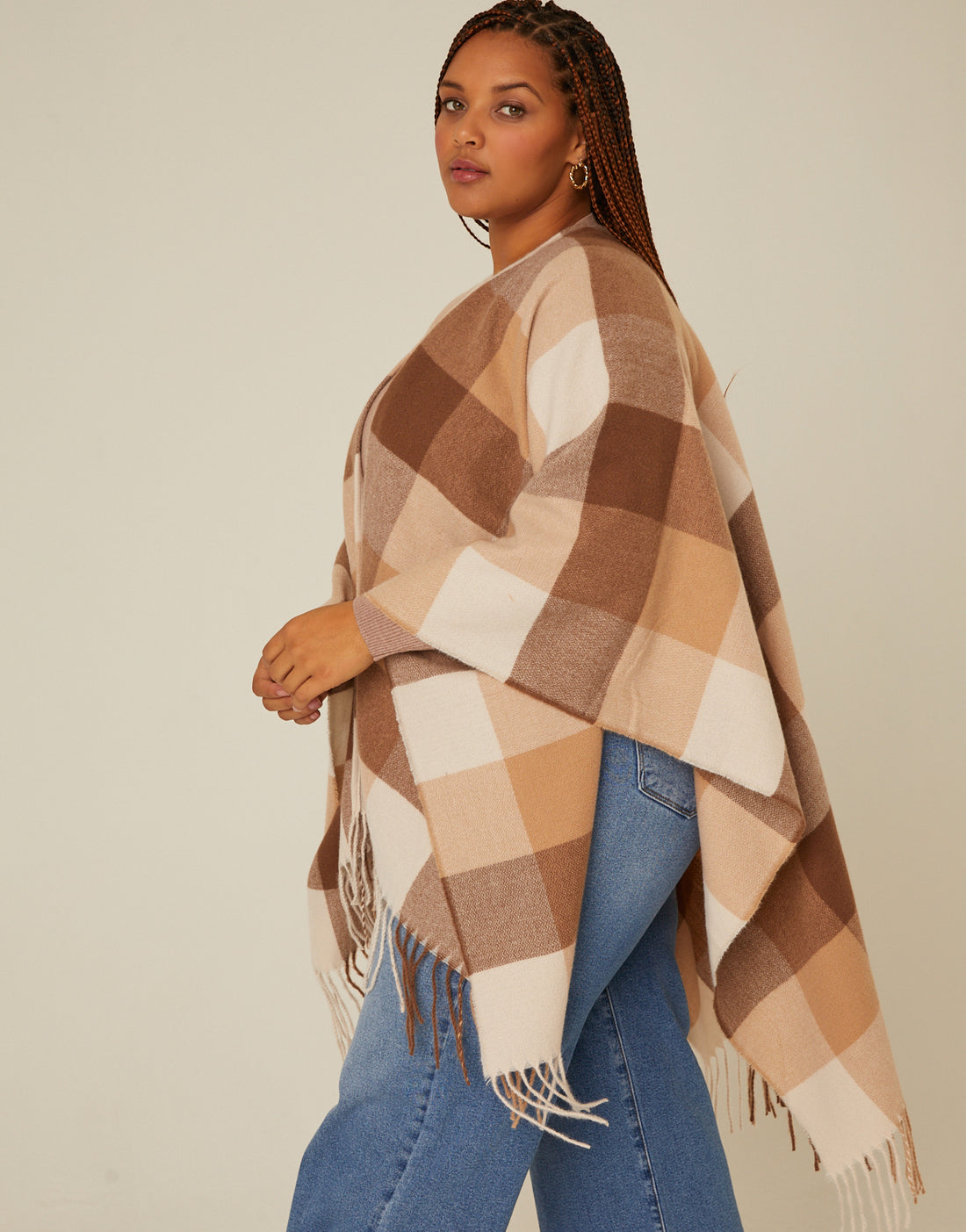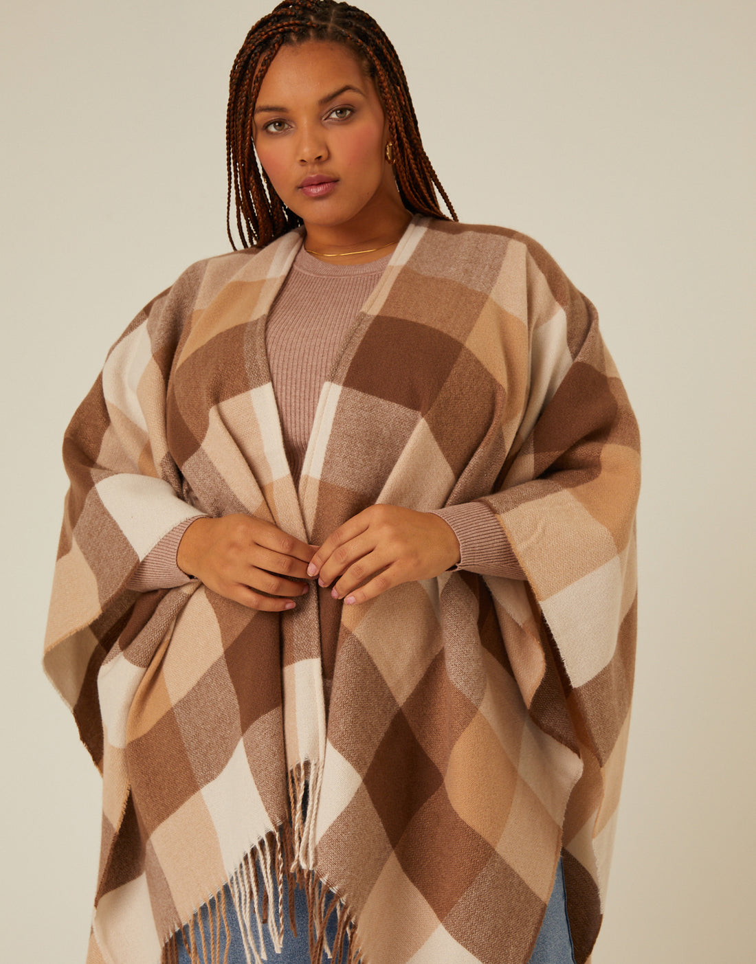 Warm as can be, the Curve Fringe Trim Plaid Poncho is a trendy, neutral-colored basic that's great for fall.