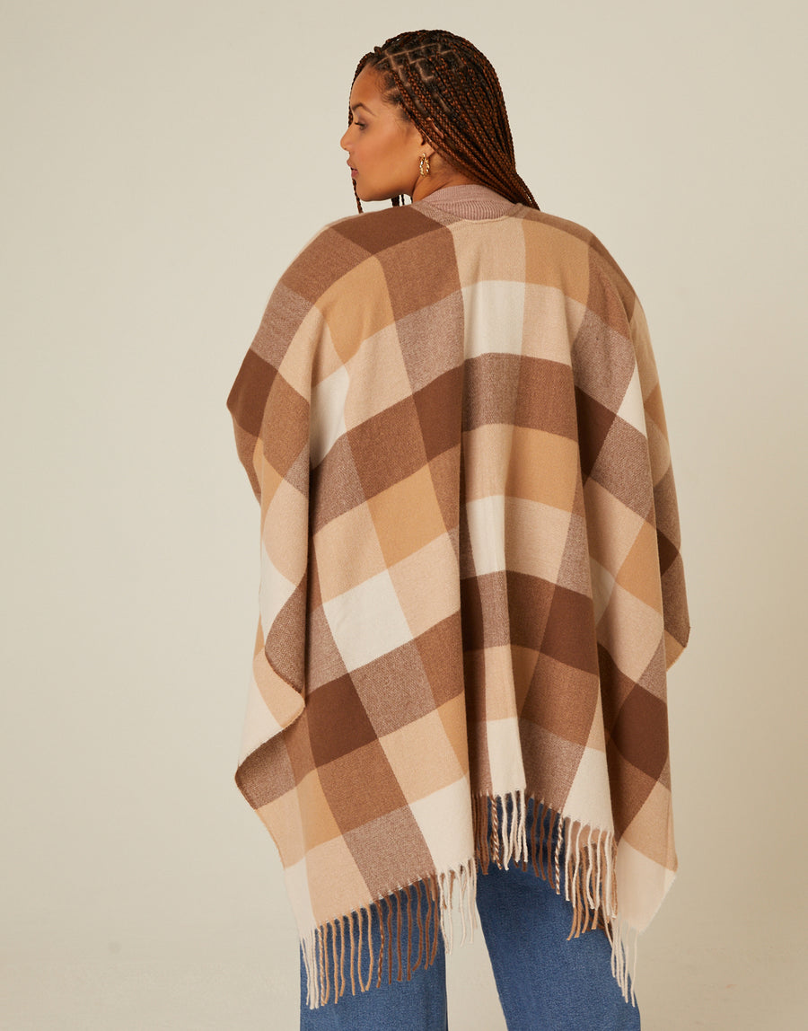- This poncho features a soft, non-stretchy woven material with a plaid pattern, twisted fringe edges, and an open front.