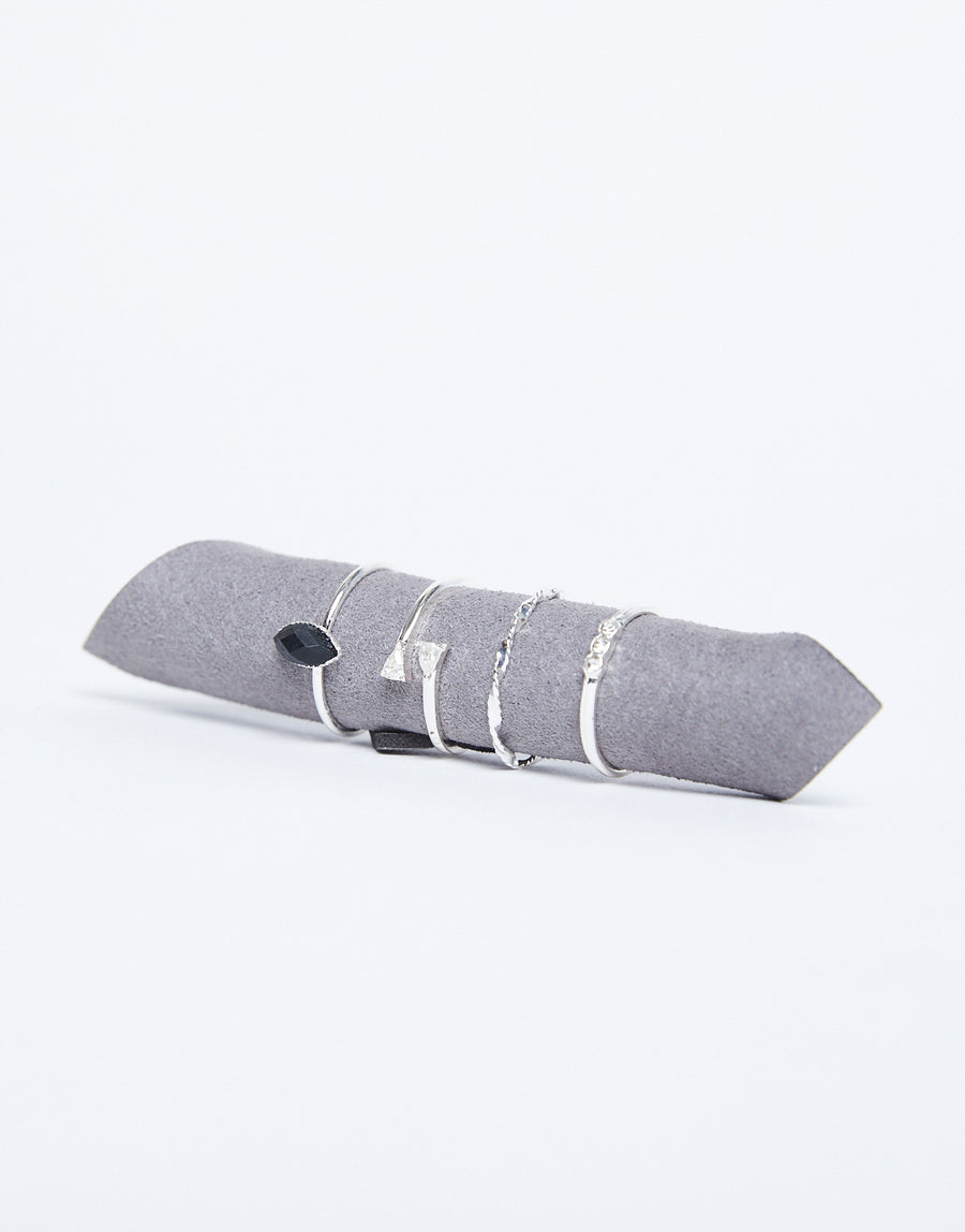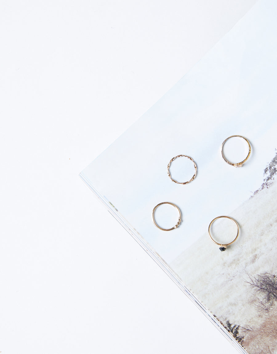 One of our new fave ring sets, the Genevive Black Stone Ring Set is sure to be your go-to daily jewelry from now on. The set features four unique but matching rings: one twisted ring, one ring with a black gemstone, one ring with three small, clear gems, and one wrapped ring with a gem on either end, these rings look adorable as a set and just as cute when worn separately. Each ring measures at 3", and all come on a small piece of faux suede for easy travel.