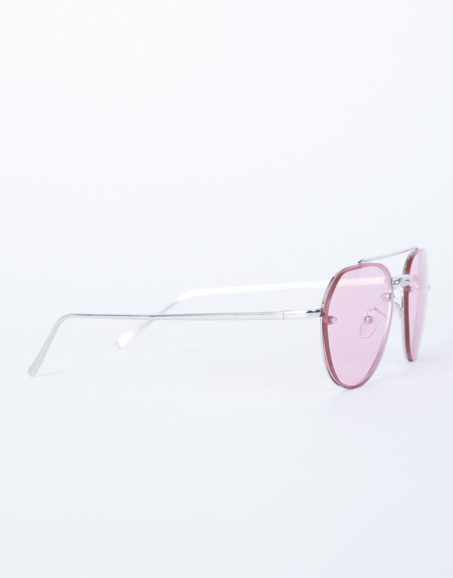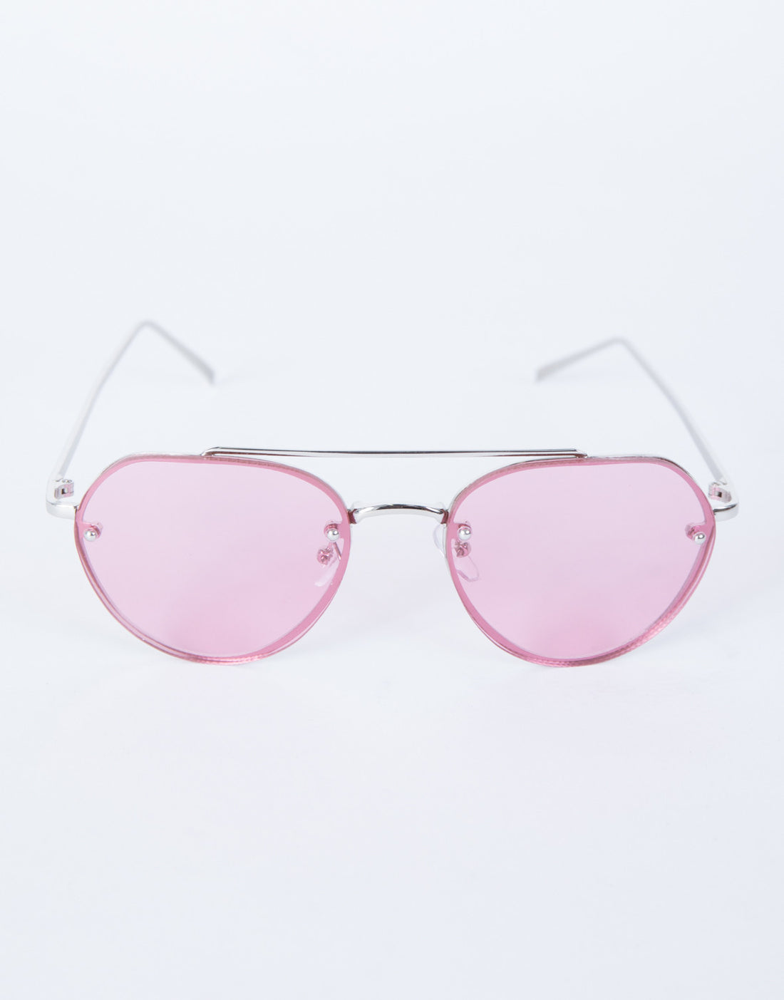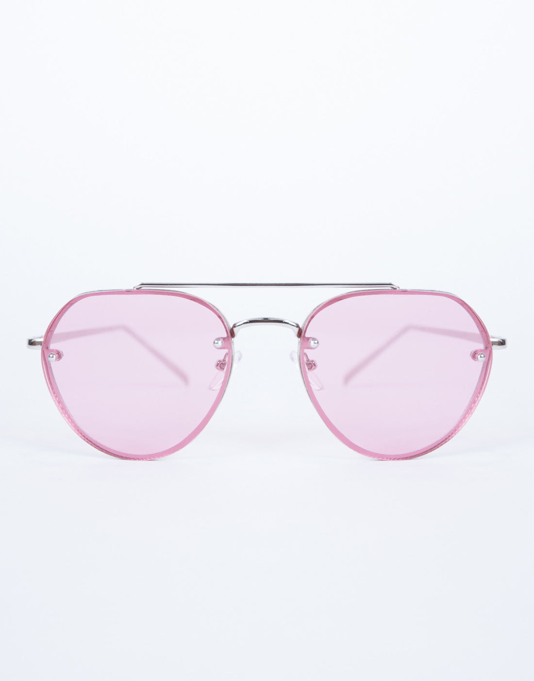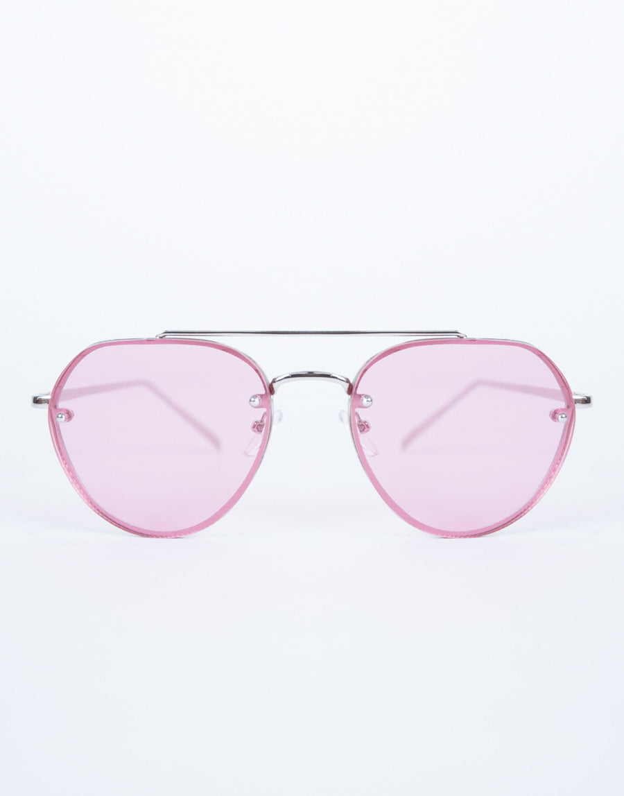 These Minimal Aviator Sunnies are a classic style with mini soft colored lens and thin metal frame. These sunglasses also feature a metal nose bridge and soft rubber nose pads for a comfy wear. Comes in a silver, pink, or black color of your choice. Pair these colored aviators with a v neck tee, destroyed boyfriend jeans, and pointy leather sneakers for a model off-duty vibe.
