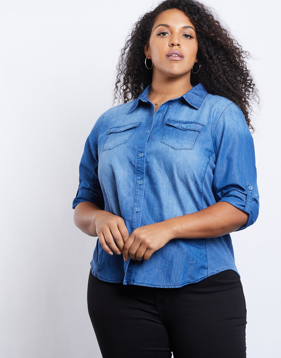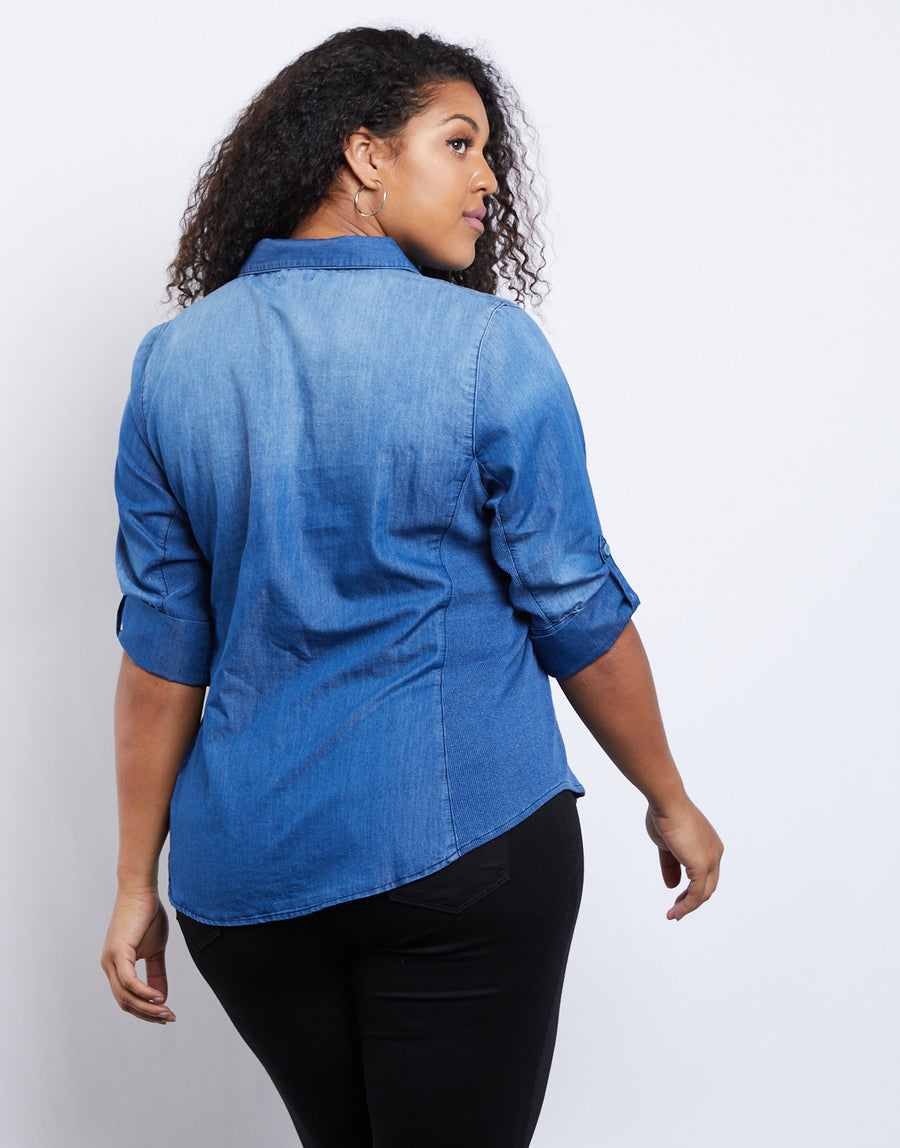 The key to a cute and easy outfit? The Curve Chambray Button Down! This cute woven top features a folded down collar, functional pockets, real buttons down the front, cuffed and buttoned sleeves that end at the elbow, and stretchy, ribbed knit side panels that make it fitted yet comfortable. The top also has intentional ombre fading for a vintage quality. Pair it with some black jeans and combat boots and you have a timeless outfit good for multiple occasions!
