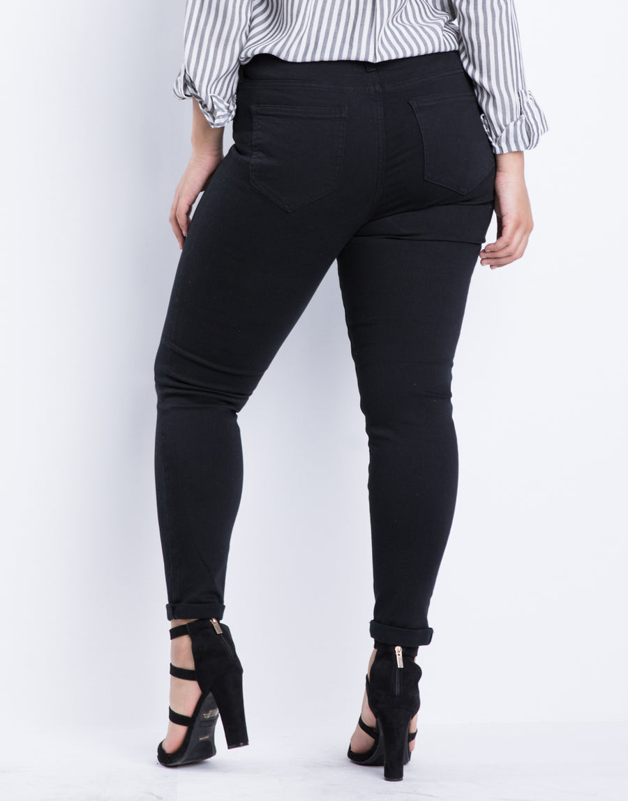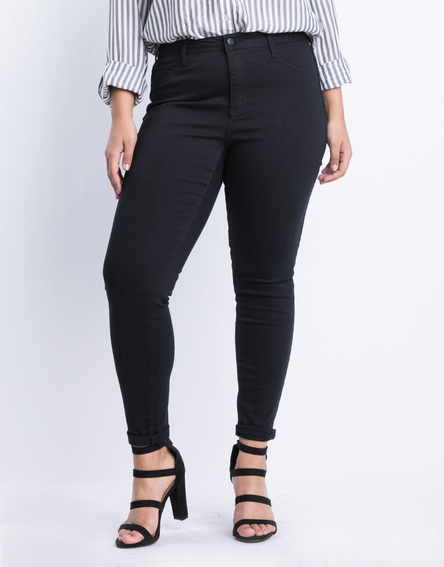 The Curve Day To Day Jeans are a great pair of basic high rise skinny jeans. Back pockets are fully functional but front pockets are decorative. They have a zipper and single button closure, and 5 belt loops. They're made from a medium weight woven material that has a bit of stretch to fit comfortably. They are shown cuffed but may be worn rolled down as well. We love these black skinny jeans with a tube top, light wash denim jacket and simple white sneakers.