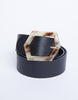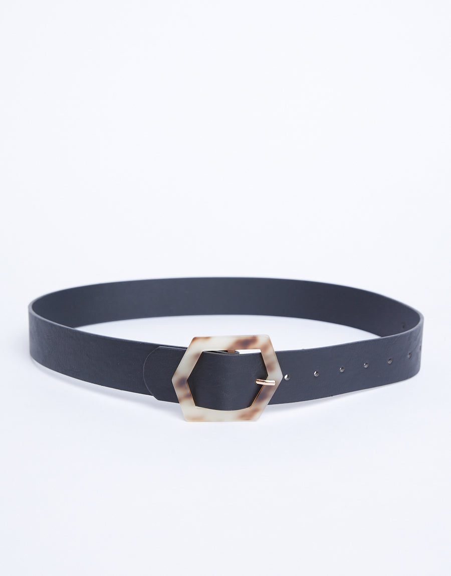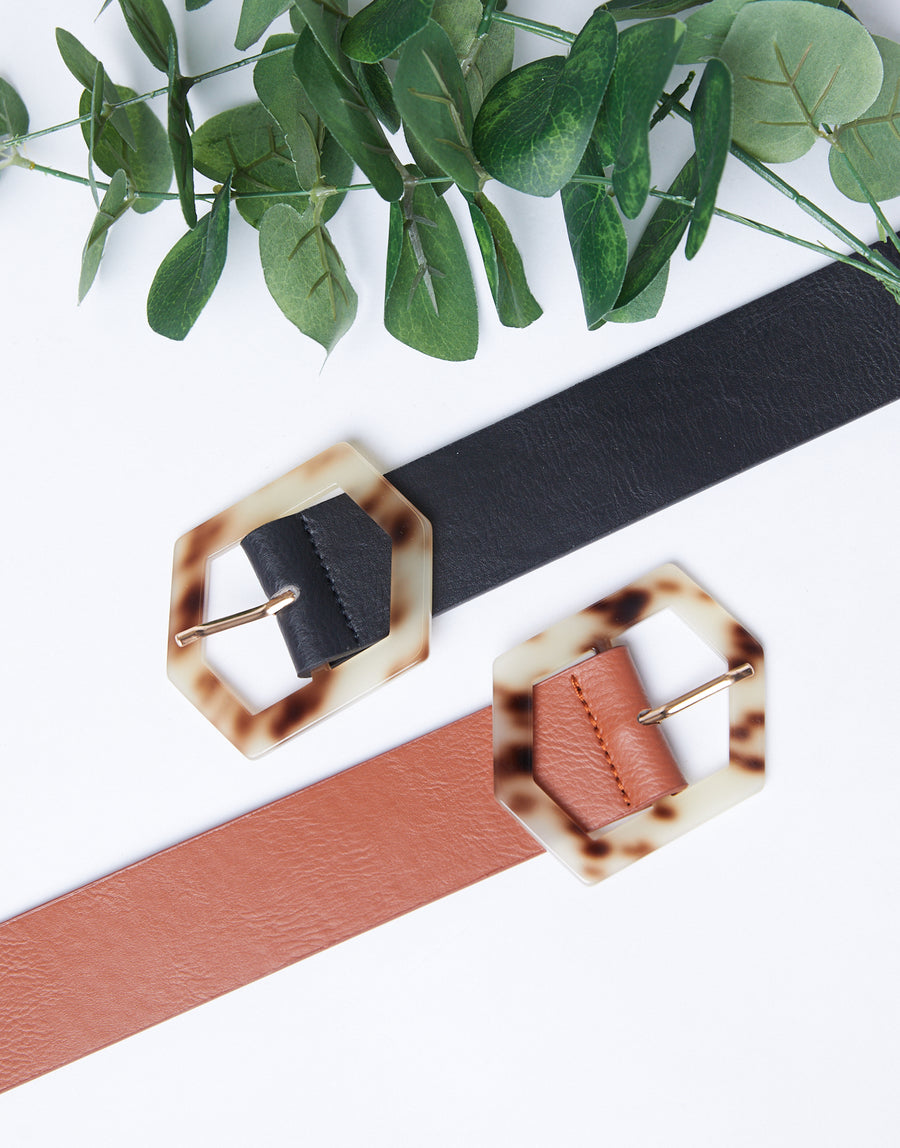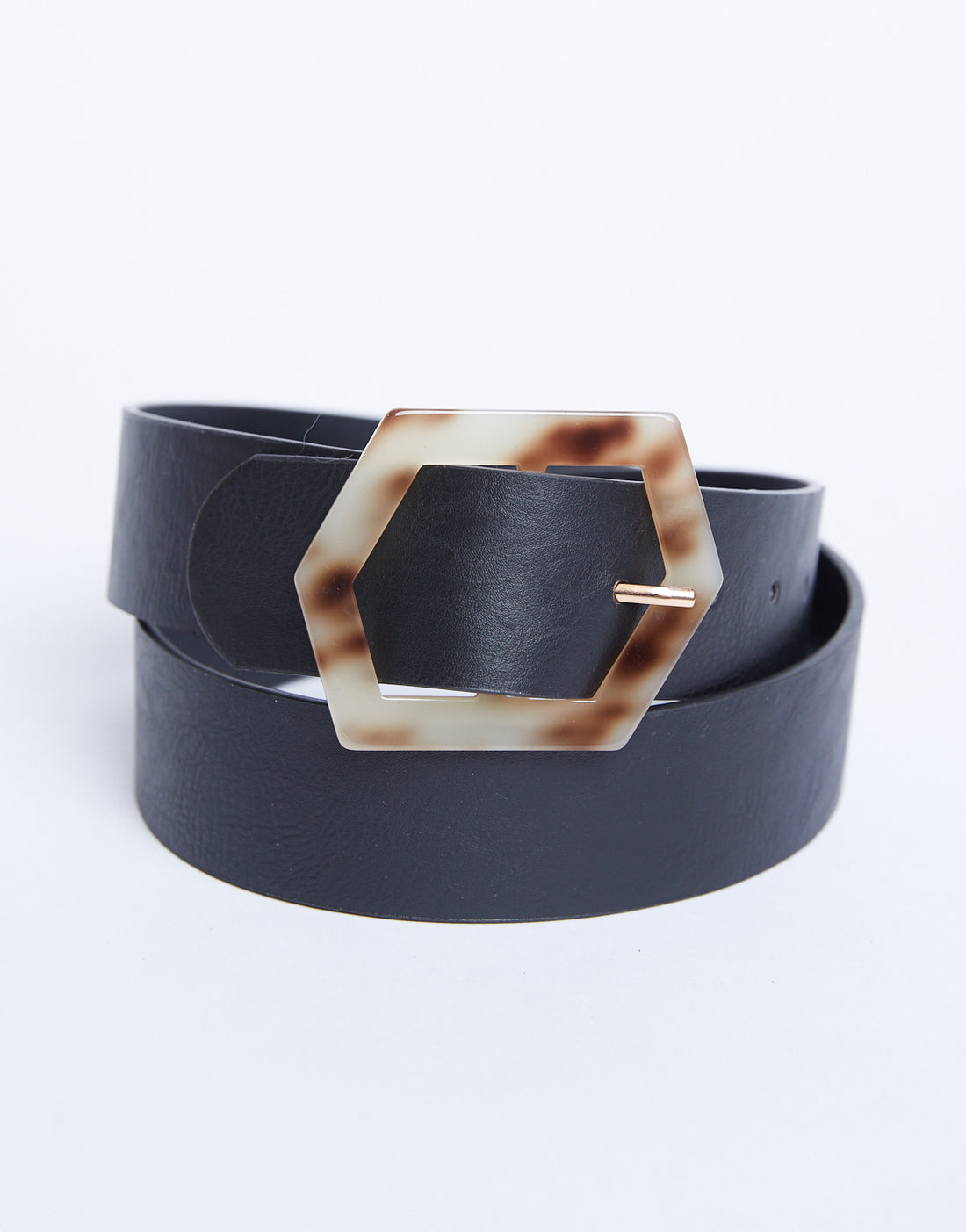 Add a unique flair to any look with the Hexagon Buckle Belt. Featuring a thick strap and a hexagon-shaped tortoise print buckle, this belt is unique and retro, and a piece that is sure to stand out. Let this belt speak for itself, and wear this dress around the waist with a silky slip dress, or simply pair it with some high waisted jeans and a cami. This belt measures 1.5" wide and has 11 adjustable straps measuring 29" at its shortest and 39" at its longest.
