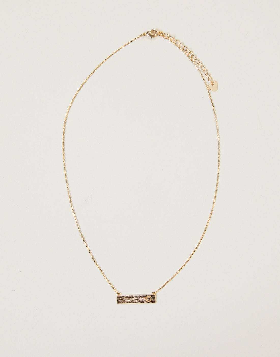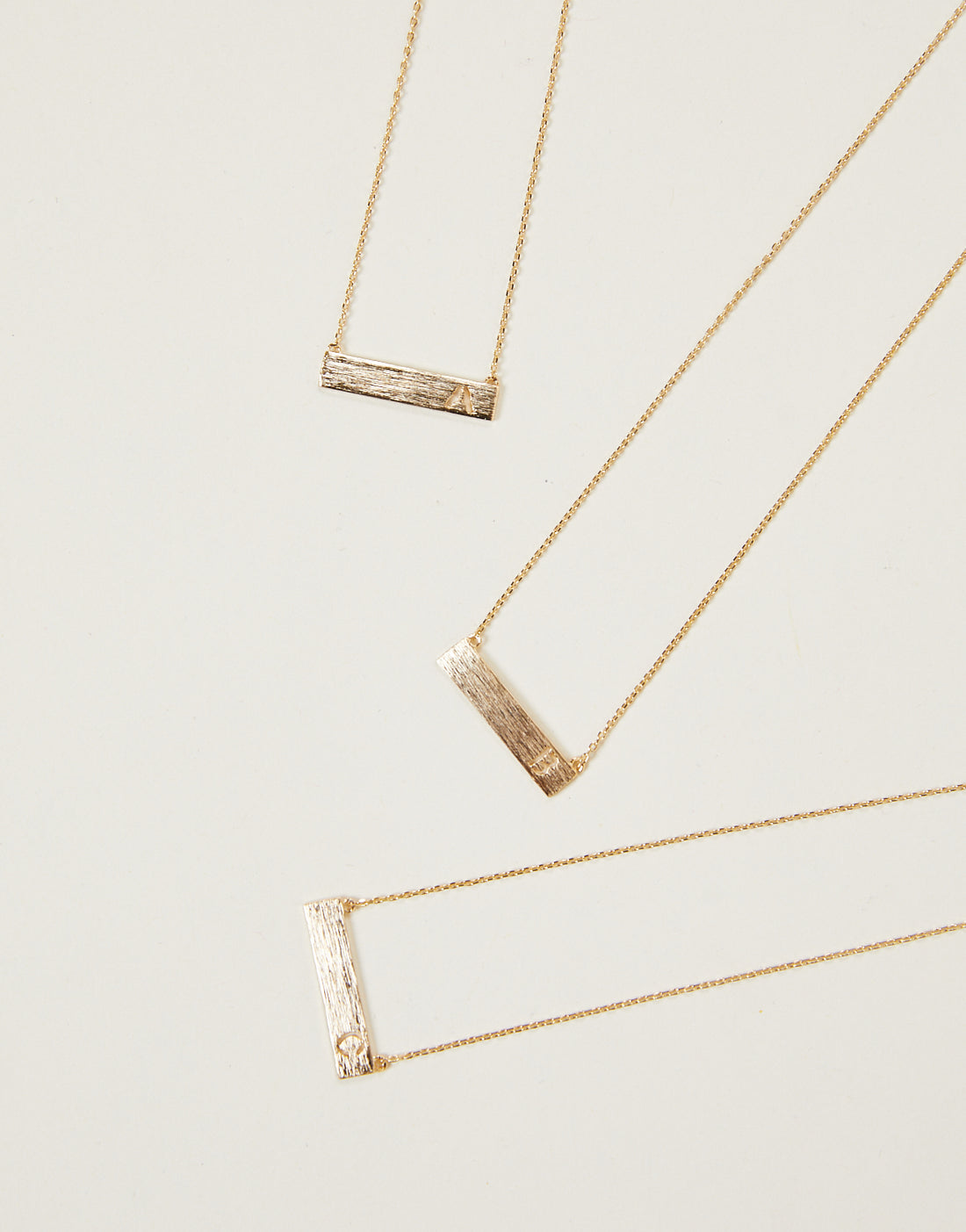The Initial Bar Necklace is a minimalist take on the personalized trend. This pendent comes is sold separately and features cutout letters of A, B, and C. Pair this with other layering necklaces a unique look.