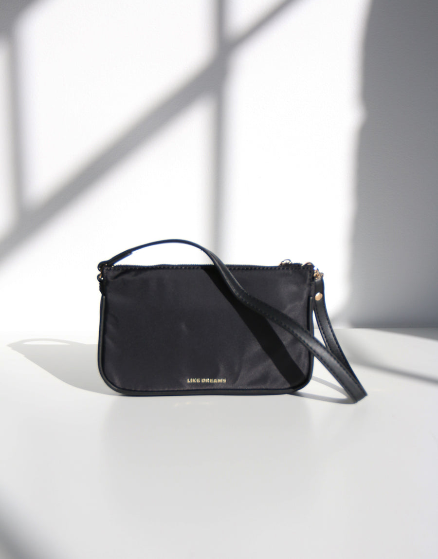 - This rectangular bag features a woven, faux leather shoulder strap, a small logo that says "like dreams", one main zipper compartment, one smaller zipper pocket inside, and two small flap pockets.