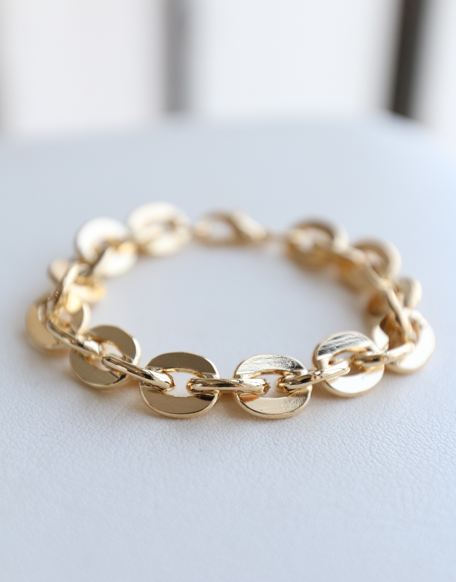 - This bracelet features a gold chunky chain and a simple lobster clasp.