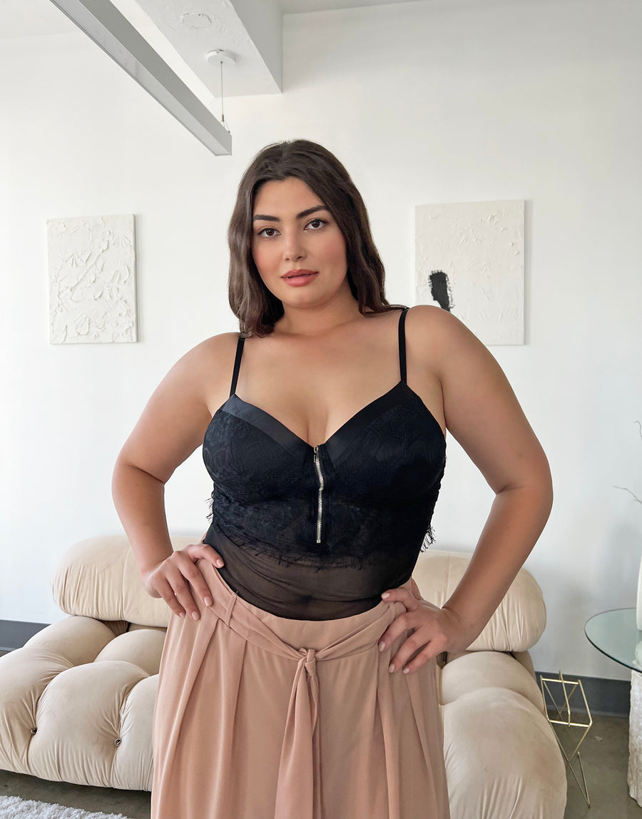 - This bodysuit features a lightly padded bra, a front zip detail, a mesh design, a snap bottom closure, adjustable straps, and a bodycon silhouette.