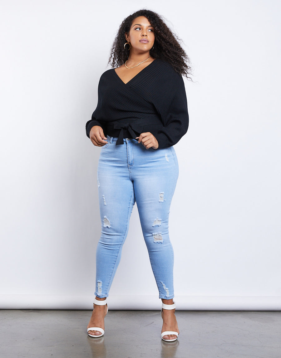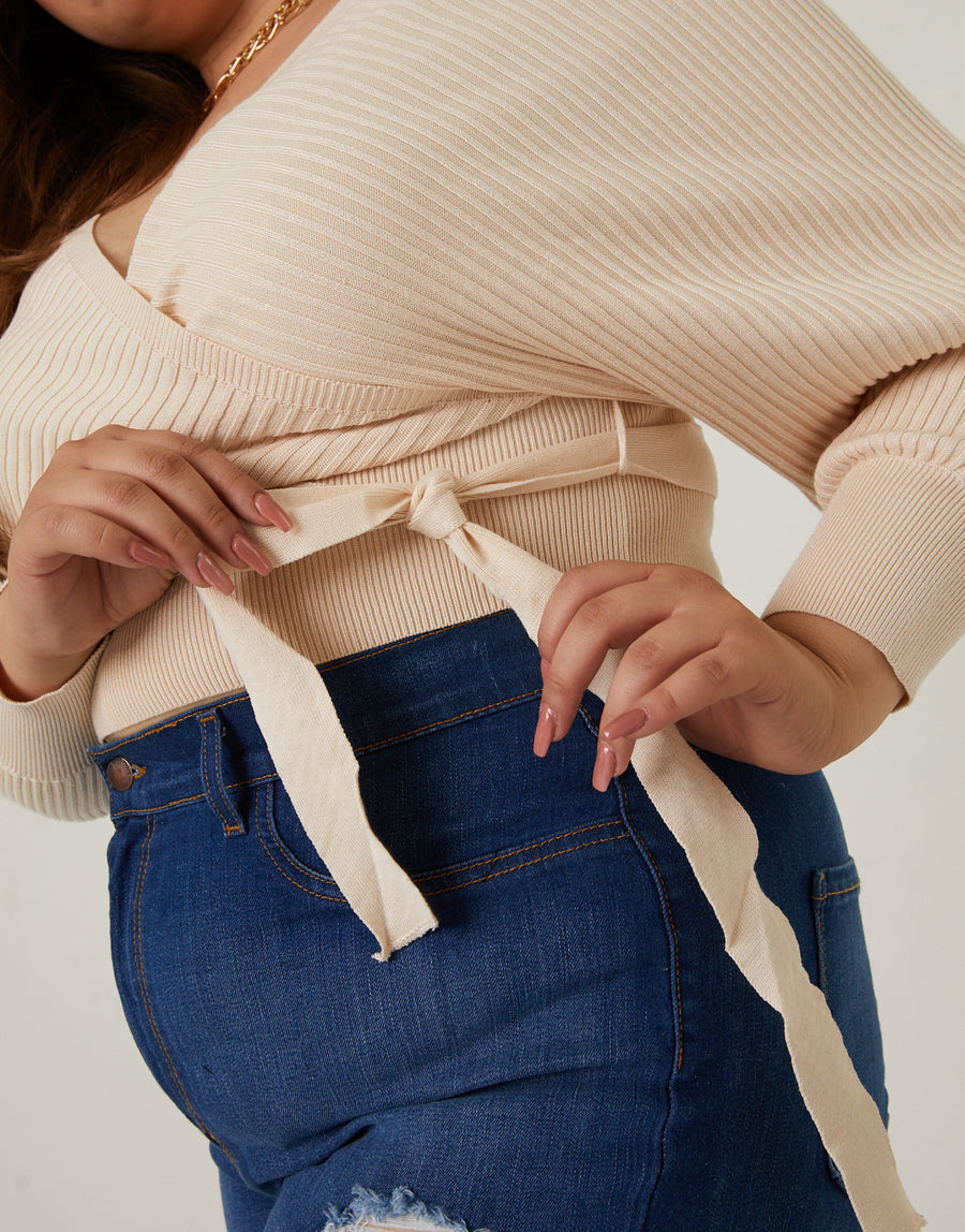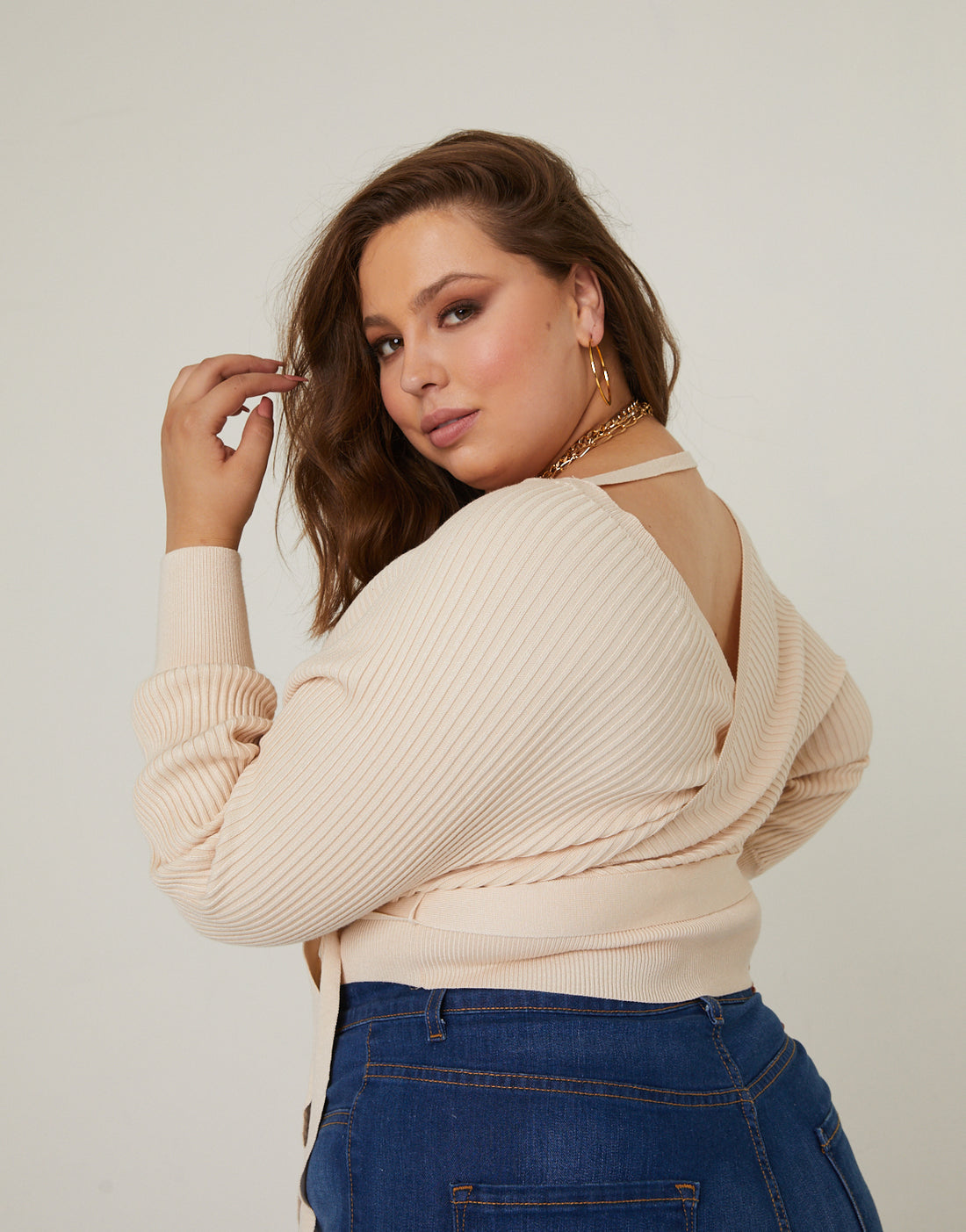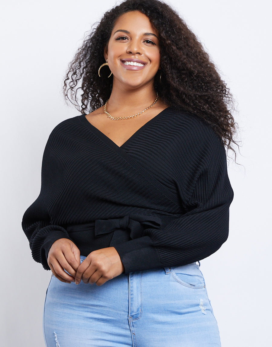 The Plus Size Leigh V-Neck Sweater is simple and elegant, making it a great wardrobe staple all year round. The sweater is made from a mid-weight, ribbed material and features a surplice style, a v-shaped neckline, a deep v-shaped hem on the back, a small strap across the back of the neck, tapered wrists, and a matching belt that detaches and can be tied however you prefer. It's a super flattering top that's easy to dress up with a long skirt, a pair of cute heels, and some layered necklaces. Easy as that!
