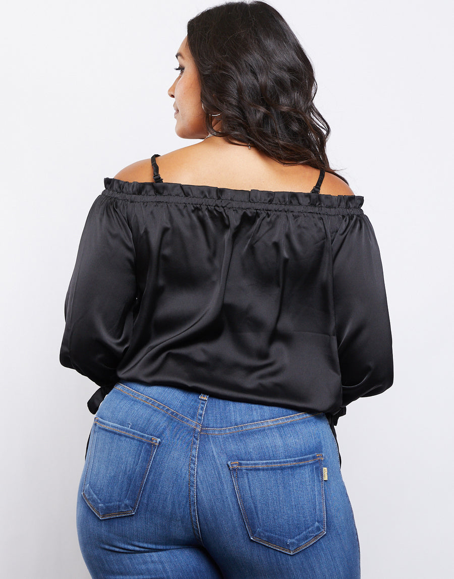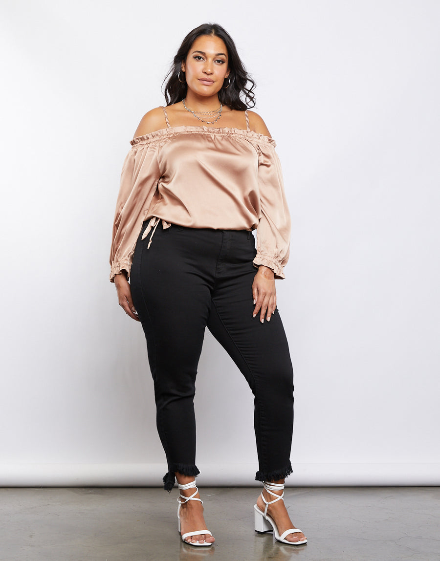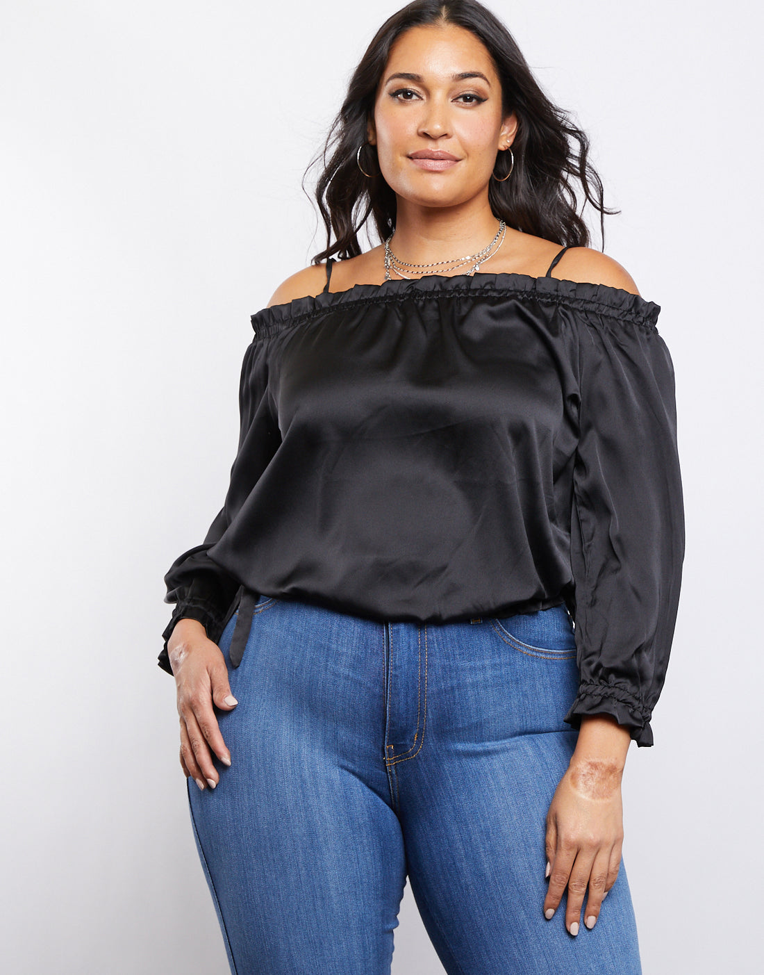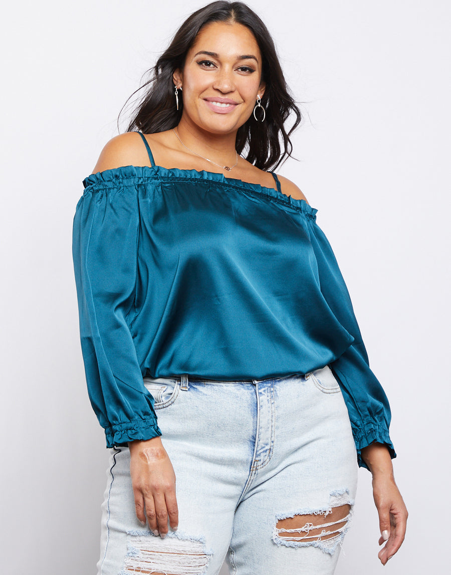 Head out on the town with your girls in our Curve Satin Ruffle Top! This lovely piece is made from a shiny satin woven material and features an off-the-shoulder top hem, adjustable shoulder straps, a false drawstring tie on each hip, and elastic ruffles on the top, bottom, and sleeve hems. The top is not stretchy other than on the elastic hems. We pair this top with patterned pants or skinny jeans for a classy look that would be perfect for a night out. The rich jewel tone colors are to die for, we might need one of each!
