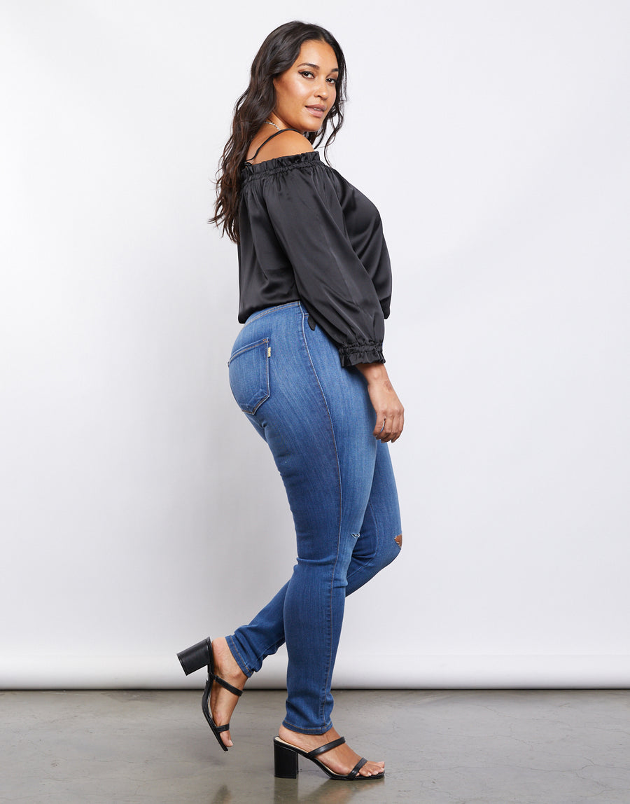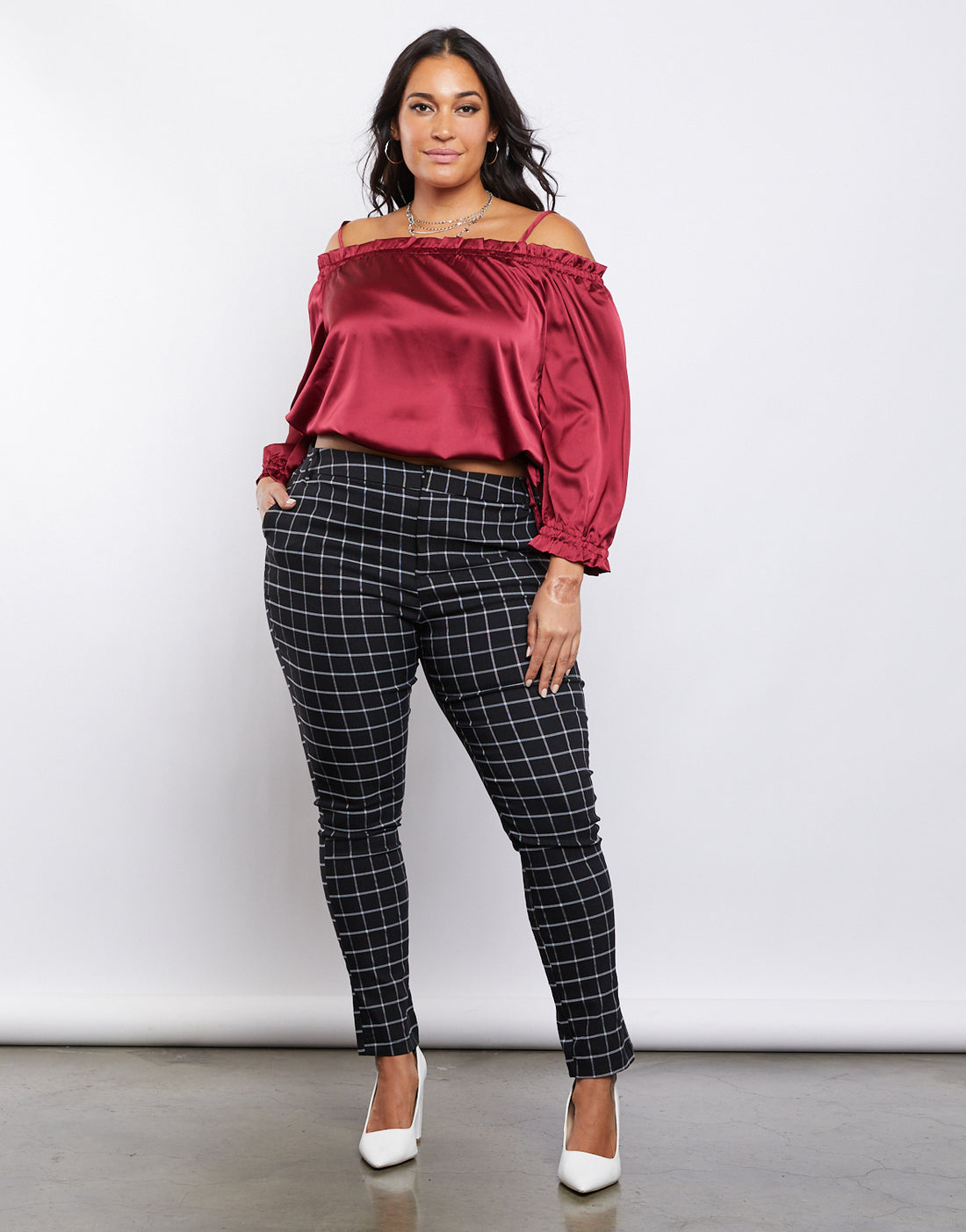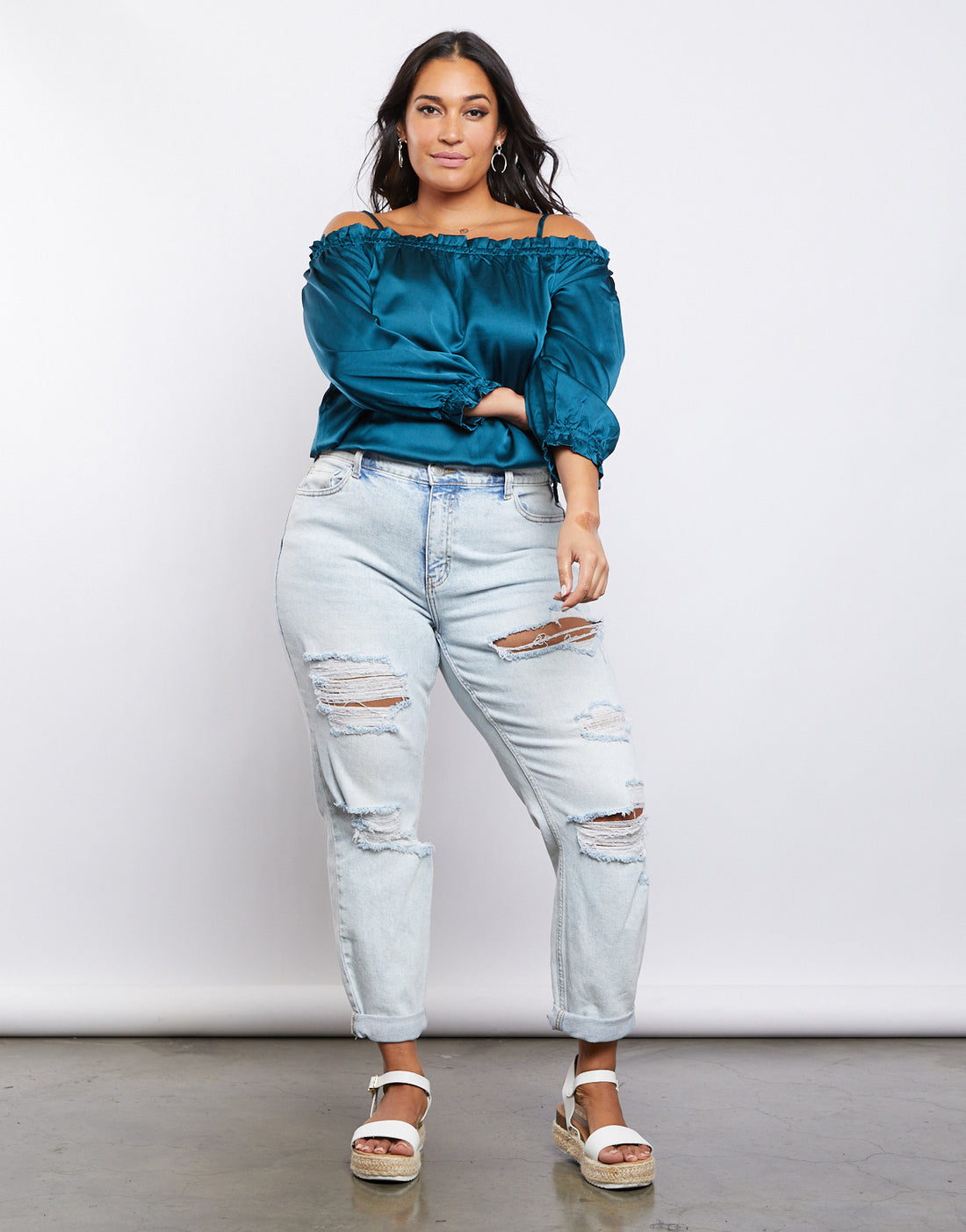 Head out on the town with your girls in our Curve Satin Ruffle Top! This lovely piece is made from a shiny satin woven material and features an off-the-shoulder top hem, adjustable shoulder straps, a false drawstring tie on each hip, and elastic ruffles on the top, bottom, and sleeve hems. The top is not stretchy other than on the elastic hems. We pair this top with patterned pants or skinny jeans for a classy look that would be perfect for a night out. The rich jewel tone colors are to die for, we might need one of each!