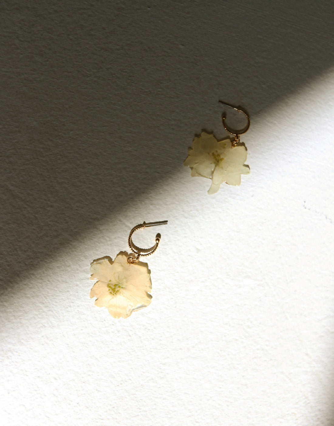 - These earrings are incomplete hoops with a post back and a real flower encased in resin charm.