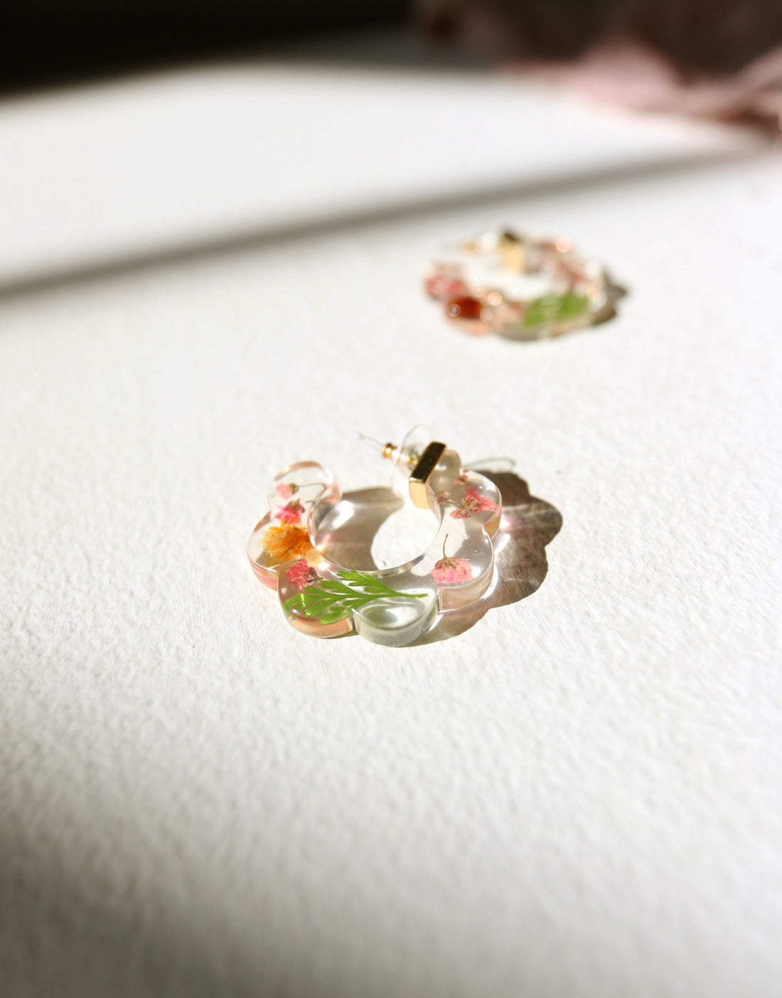 - These earrings are an incomplete hoop design with a post back and made with flowers in resin.