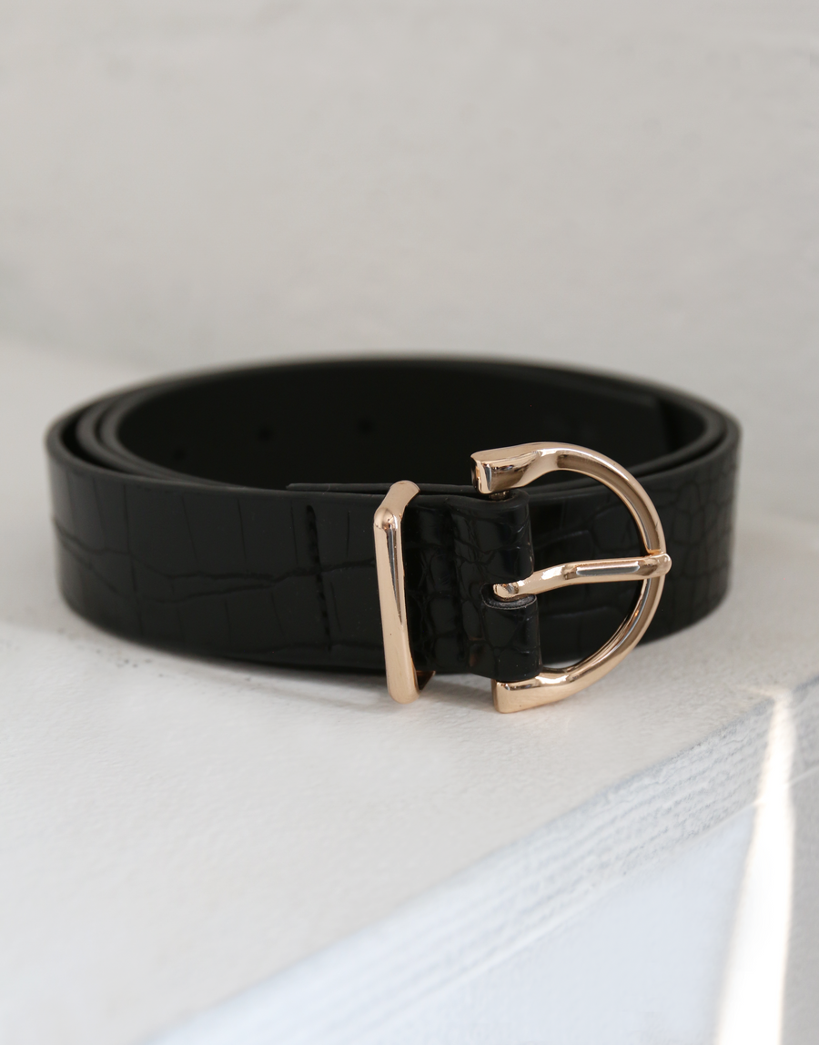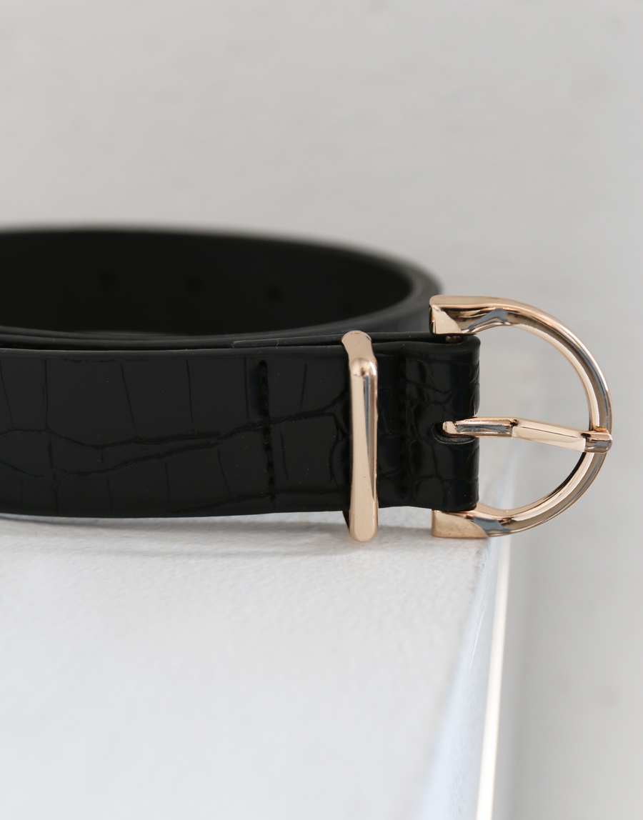 - The faux leather belt has a captivating croc texture and is finished off with a semi-rounded gold buckle.